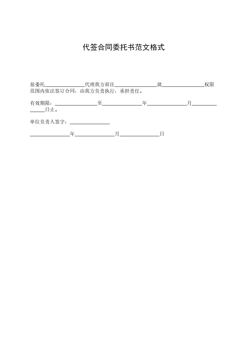兹委托________________代理我方前往_________________就_________________权限范围内依法签订合同,由我方负责执行,承担责任。 有效期限:_________________至________________年________________月________________日止。 单位负责人签字:________________ ________________年________________月________________日