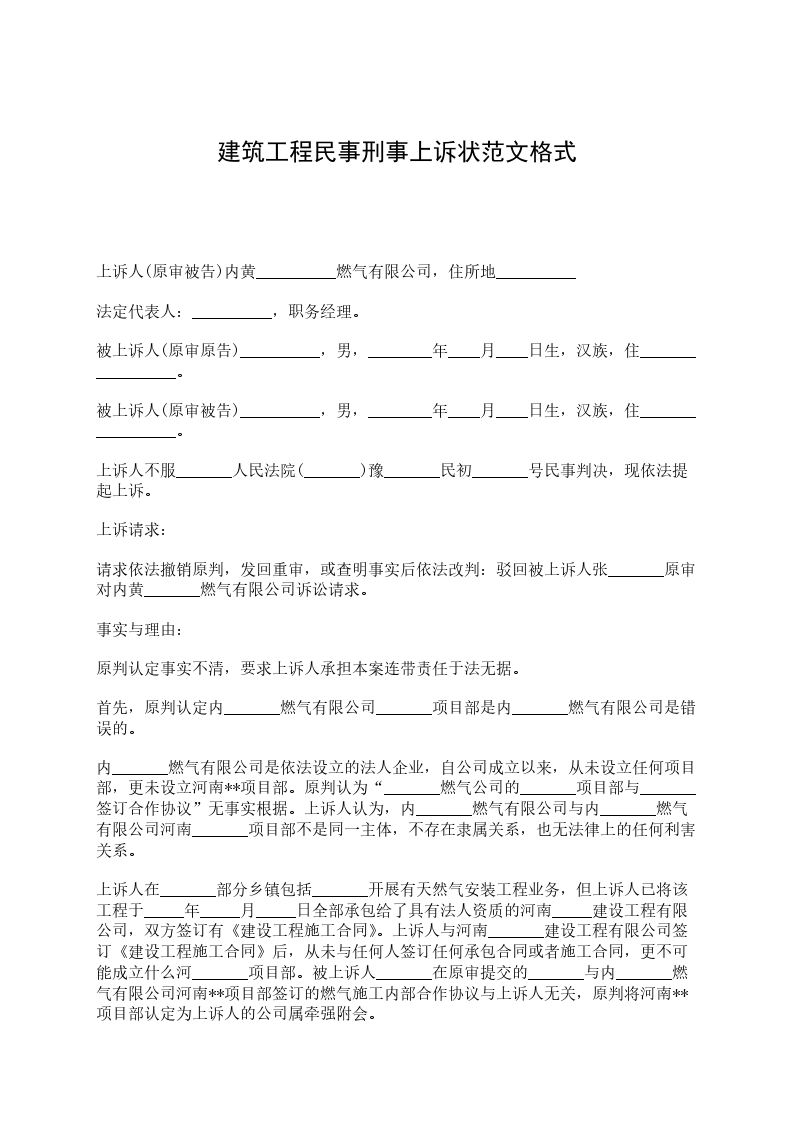 上诉人(原审被告)内黄__________燃气有限公司,住所地__________ 法定代表人:__________,职务经理。 被上诉人(原审原告)__________,男,________年____月____日生,汉族,住_________________。 被上诉人(原审被告)__________,男,________年____月____日生,汉族,住_________________。 上诉人不服_______人民法院(_______)豫_______民初_______号民事判决,现依法提起上诉。 上诉请求: 请求依法撤销原判,发回重审,或查明事实后依法改判:驳回被上诉人张_______原审对内黄_______燃气有限公司诉讼请求。 事实与理由: 原判认定事实不清,要求上诉人承担本案连带责任于法无据。 首先,原判认定内_______燃气有限公司_______项目部是内_______燃气有限公司是错误的。 内_______燃气有限公司是依法设立的法人企业,自公司成立以来,从未设立任何项目部,更未设立河南**项目部。原判认为“_______燃气公司的_______项目部与_______签订合作协议”无事实根据。上诉人认为,内_______燃气有限公司与内_______燃气有限公司河南_______项目部不是同一主体,不存在隶属关系,也无法律上的任何利害关系。 上诉人在_______部分乡镇包括_______开展有天然气安装工程业务,但上诉人已将该工程于_____年_____月_____日全部承包给了具有法人资质的河南_____建设工程有限公司,双方签订有《建设工程施工合同》。上诉人与河南_______建设工程有限公司签订《建设工程施工合同》后,从未与任何人签订任何承包合同或者施工合同,更不可能成立什么河_______项目部。被上诉人_______在原审提交的_______与内_______燃气有限公司河南**项目部签订的燃气施工内部合作协议与上诉人无关,原判将河南**项目部认定为上诉人的公司属牵强附会。 上诉人认为,本案应当举证证明内黄_______燃气有限公司河南_______项目部是否具有民事主体资格,是否具有独立承担民事责任能力,设立内黄_______燃气有限公司河南_______项目部的机构是谁。以上问题弄清楚了,其他问题也就迎刃而解了。依据民事诉讼法第64条规定,查明以上事实举证责任在被上诉人张_______一方。原判在没有查明以上事实的前提下,仅凭被上诉人提交的《燃气施工内部合作协议》冠上了上诉人的名称就认定是上诉人公司的行为是不负责任的。 其次,原判要求上诉人承担连带责任于法无据。 原审原告张_______受雇于被上诉人王_______,张_______在受雇过程中受到伤害,应当得到赔偿。而上诉人将该工程整体承包给了河南**建设工程有限公司,河南_______建设工程有限公司又将该工程一部分承包给了没有建筑资质的王_______,对于张_______在工作中受到的伤害应当由王_______承担赔偿责任,河南_______建设工程有限公司承担连带责任,现原判要求上诉人承担连带责任有悖法律规定。 总之,原判认定事实不清,要求上诉人承担连带责任于法无据。望二审法院依法准入上诉人上诉请求。 此致 _______中级人民法院 上诉人:_______燃气有限公司 _____年_____月_____日