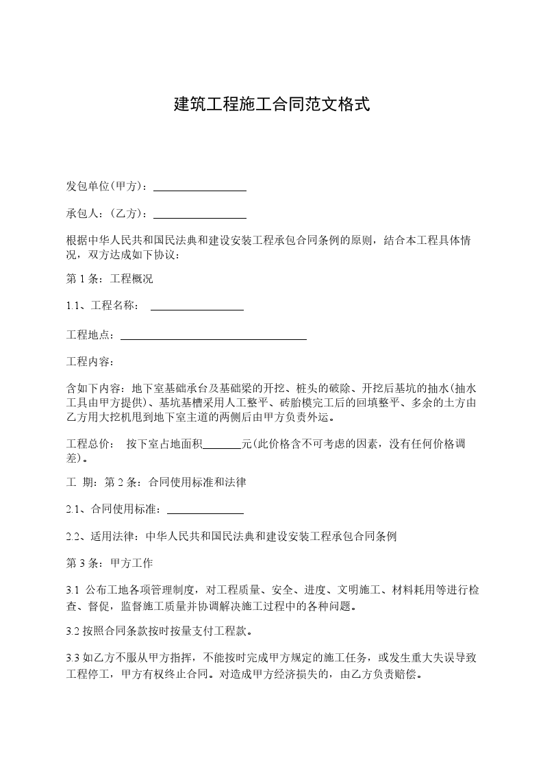 发包单位(甲方):_________________ 承包人:(乙方):_________________ 根据中华人民共和国民法典和建设安装工程承包合同条例的原则,结合本工程具体情况,双方达成如下协议: 第1条:工程概况 1.1、工程名称: _________________ 工程地点:__________________________________ 工程内容: 含如下内容:地下室基础承台及基础梁的开挖、桩头的破除、开挖后基坑的抽水(抽水工具由甲方提供)、基坑基槽采用人工整平、砖胎模完工后的回填整平、多余的土方由乙方用大挖机甩到地下室主道的两侧后由甲方负责外运。 工程总价: 按下室占地面积_______元(此价格含不可考虑的因素,没有任何价格调差)。 工 期:第2条:合同使用标准和法律 2.1、合同使用标准:______________ 2.2、适用法律:中华人民共和国民法典和建设安装工程承包合同条例 第3条:甲方工作 3.1 公布工地各项管理制度,对工程质量、安全、进度、文明施工、材料耗用等进行检查、督促,监督施工质量并协调解决施工过程中的各种问题。 3.2按照合同条款按时按量支付工程款。 3.3如乙方不服从甲方指挥,不能按时完成甲方规定的施工任务,或发生重大失误导致工程停工,甲方有权终止合同。对造成甲方经济损失的,由乙方负责赔偿。 3.4负责加强安全管理、完善安全规章制度,做好安全设防。 3.5对乙方违反各种管理制度、操作规程、安全生产、文明施工规定的人员甲方有权清理出施工现场。乙方不服从甲方现场施工员的安排,不能按时、按量、按要求完成施工任务(或整改内容)的,甲方有权另行安排人员完成,造成的一切费用均由乙方负责,对消极对待、屡教不改的,甲方有权终止协议;中途退场的,甲方有权不付任何工资费用。 第4条:乙方工作 4.1乙方须安排一个负责人长期呆在现场协调工作,至该工作内容全部完成为止, 4.2 乙方严格按照甲方测量出的桩顶标高进行破除,标高测量中乙方必须派人员配合,严禁用炮机凿除,人工破除过程中不能伤及桩钢筋,破除后的桩头必须保持平整完好。预留钢筋必须按甲方的要求所预留。破除完的的桩头由乙方用挖机吊出基坑,并掩埋在车库底板以下。 4.3 前期进场必须保证有一台大挖机和两台小挖机方可开始施工,施工中乙方必须按照甲方的进度相应的增加机械人员,如进度达不到要求,甲方有权终止合同,并按完成的50%结算。 4.4 乙方进场后,甲方负责提供住宿及生活水电,乙方自带破桩工具(包括空压机)。在施工过程中,甲、乙双方必须紧密配合,确保施工进度以保证工程的如期完成。乙方人员在施工中必须注意安全,上班必须安全帽,穿胶鞋,如发生安全事故,由乙方完全负责,严格遵守公司的各项安全,生产制度和各种生活制度。另乙方必须保证施工进度,如进度严重跟不上,甲方有权中止乙方的合作。 第5条:工程款 工程款支付金额和时间:按地下室后浇带分成六块,每块垫层砼完成后按完成工程量的70%支付一次工程款,其余款项待地下室垫层全部浇筑完一周内全部付清,甲方违约的责任:甲方不按期付款,乙方有权停工,甲方应承担乙方停工期间的一切损失。乙方所收的工程款不含任何税金,乙方只提供收款收据。 第6条:合同的生效与终止 合同签字之日起生效,工程完成、工程款全部付清后合同自行终止。 第7条:合同份数:甲乙双方各执2份。 第8条:合同款未尽事宜,经双方协商后,用补充协议补充或协商解决。 甲方(公章):_________ 乙方(公章):_________ 法定代表人(签字):_________ 法定代表人(签字):_________ _________年____月____日 _________年____月____日