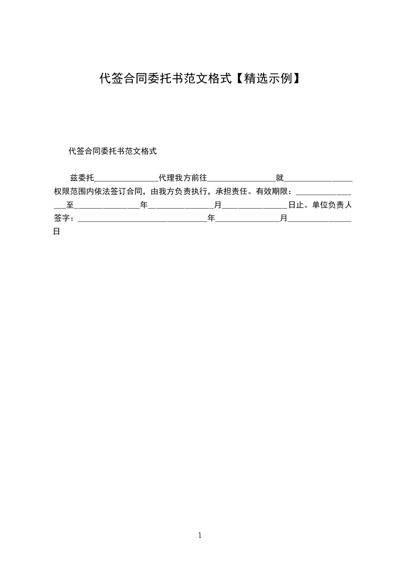 兹委托________________代理我方前往_________________就_________________权限范围内依法签订合同,由我方负责执行,承担责任。 有效期限:_________________至________________年________________月________________日止。 单位负责人签字:________________ ________________年________________月________________日