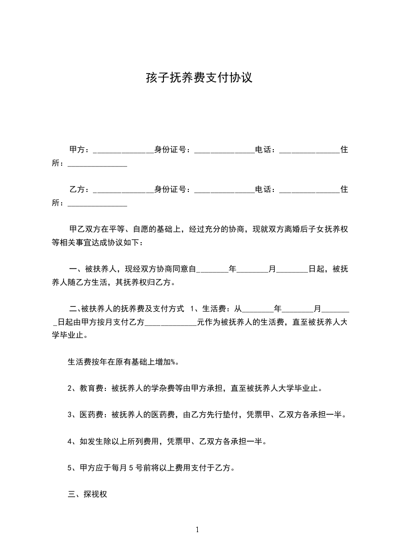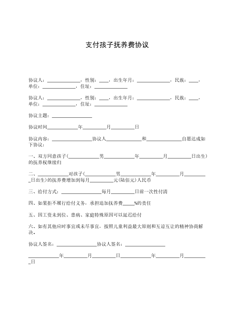 协议人:______________,性别:____,出生年月:______________,民族:____,单位:______________,住址:______________ 协议人:______________,性别:____,出生年月:______________,民族:____,单位:______________,住址:______________ 协议主题:_________________ 协议时间_____________年__________月__________日 协议内容:_________________协议人_______________和_______________自愿达成如下协议: 一、双方同意孩子(_____________男_____________年__________月__________日出生)的抚养权继续归 二、_____________对孩子(_____________男_____________年__________月__________日出生)的抚养费增加到每月__________元(陆佰元)人民币 三、给付方式:_________________每月__________日前一次性付清 四、如果拒不履行给付义务,承担追加抚养费_____%的责任 五、因工资未到位、患病、家庭特殊原因可以延迟给付 六、如有其他应时事宜或未尽事宜,按照儿童利益最大原则和互谅互让的精神协商解决。 协议人签名:_________________协议人签名:_________________ _____________年__________月__________日_____________年__________月__________日