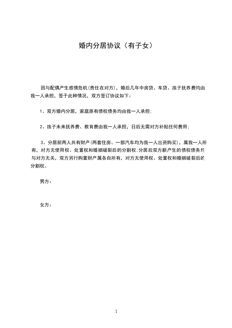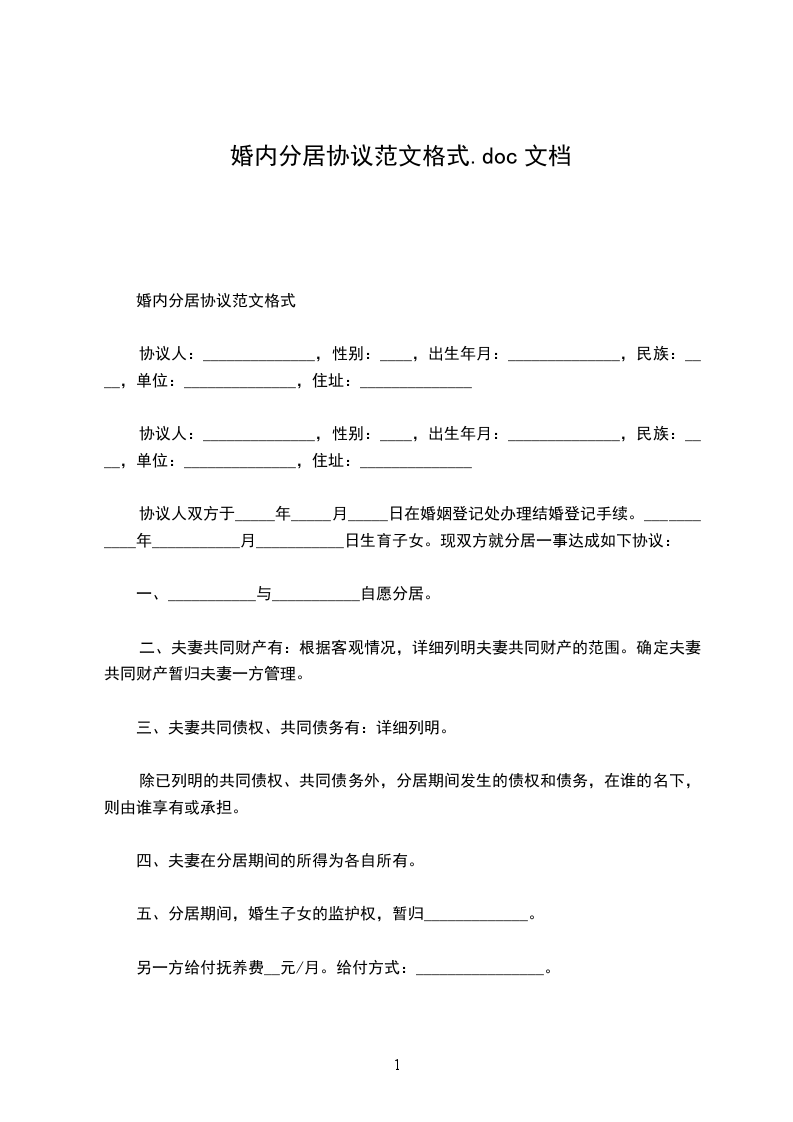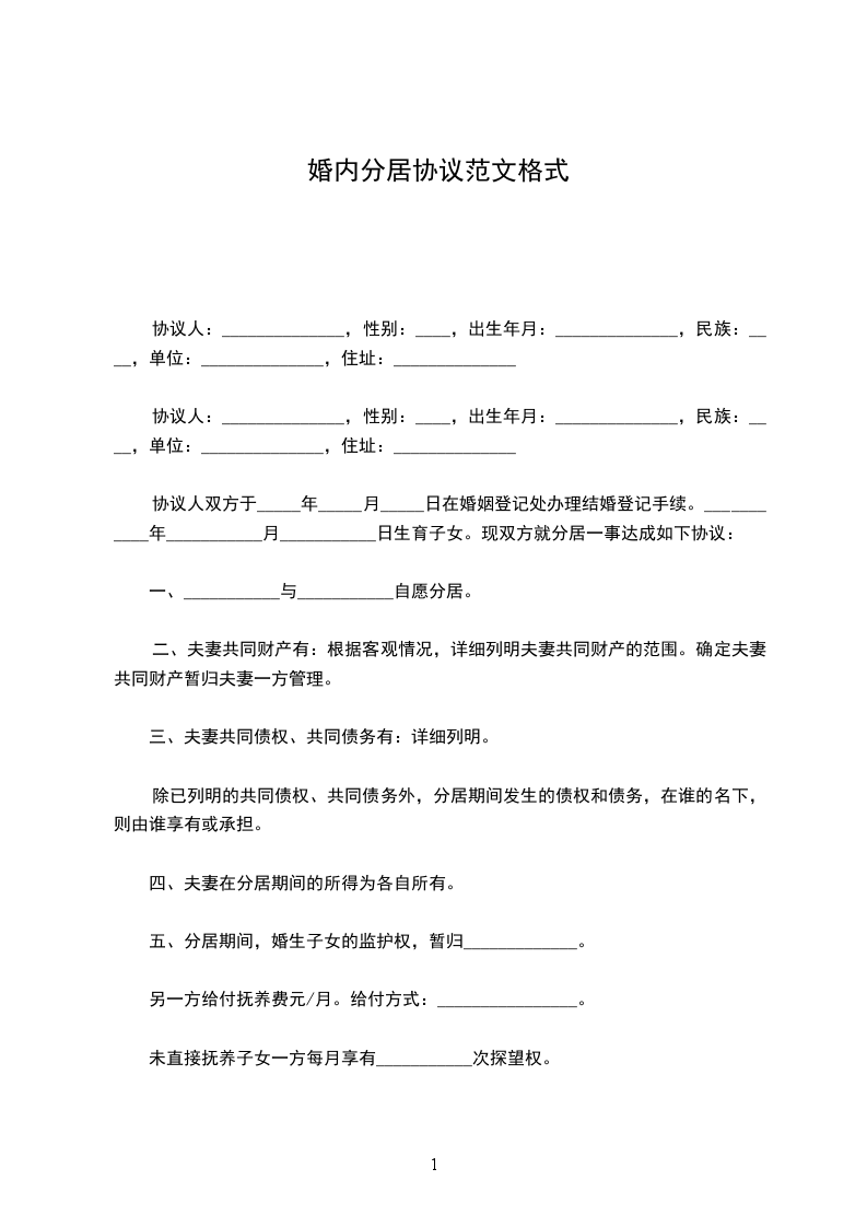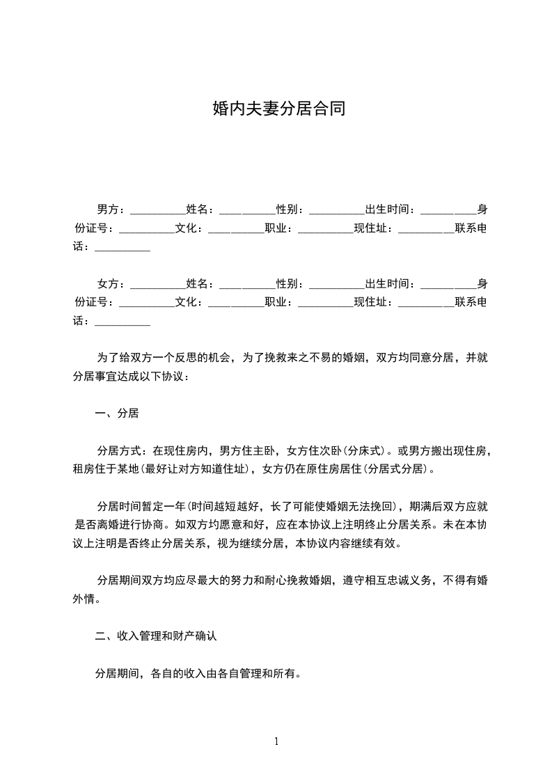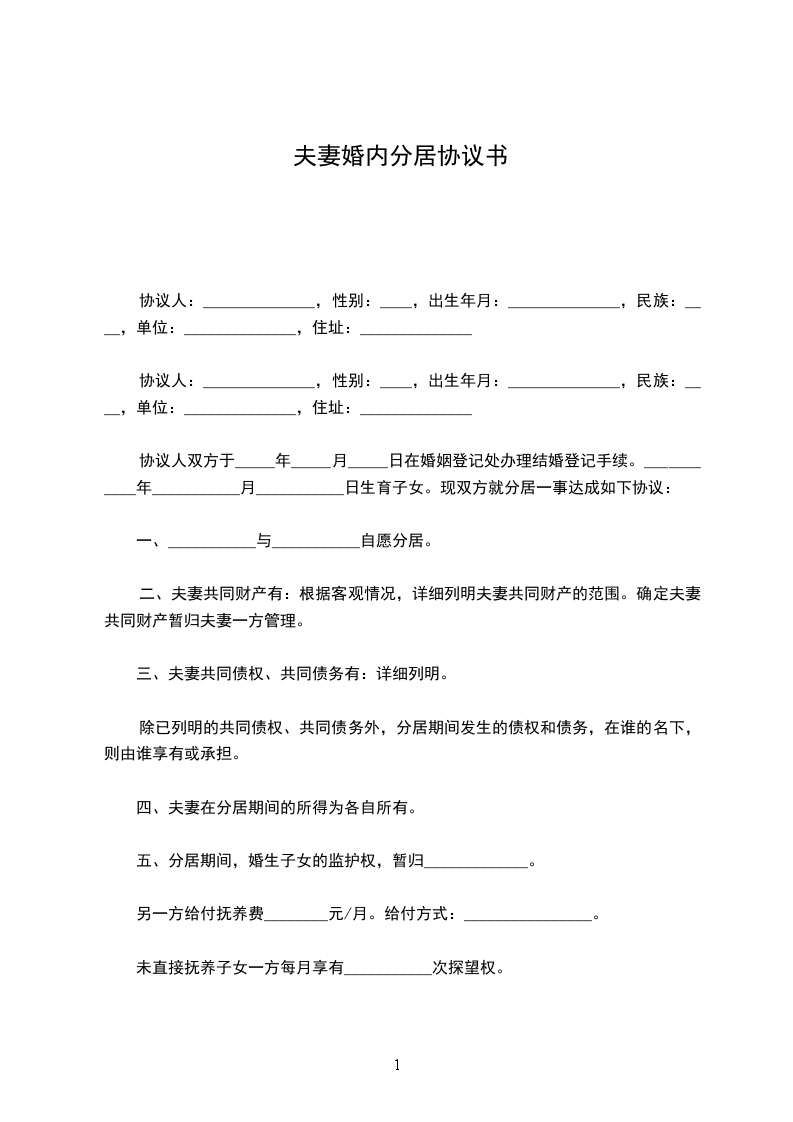 一、___________与___________自愿分居。