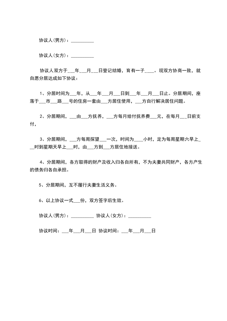 协议人双方于_____年_____月_____日在婚姻登记处办理结婚登记手续。___________年___________月___________日生育子女。现双方就分居一事达成如下协议: