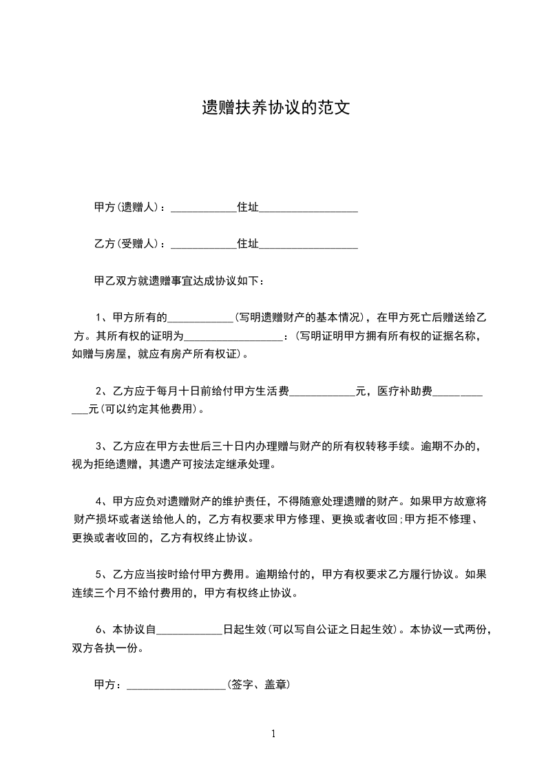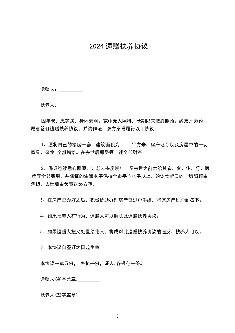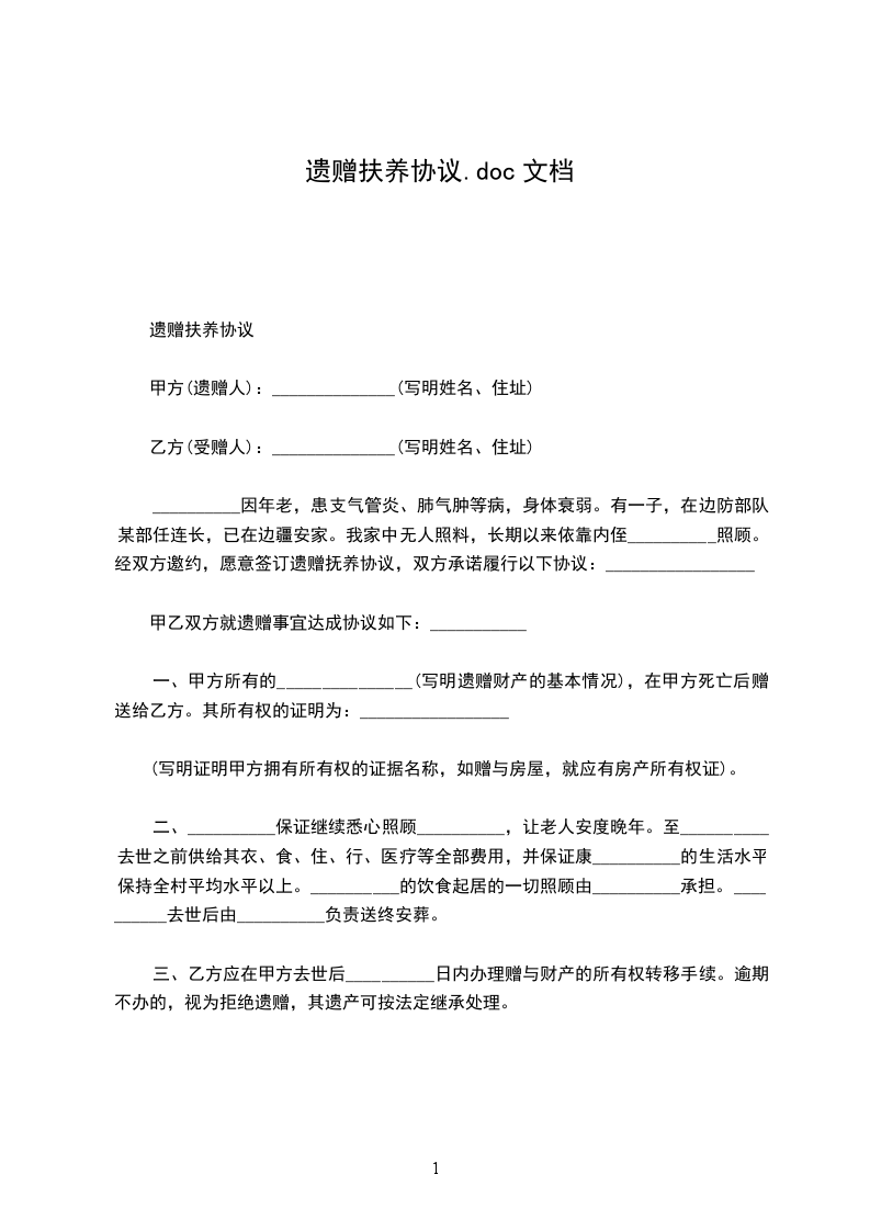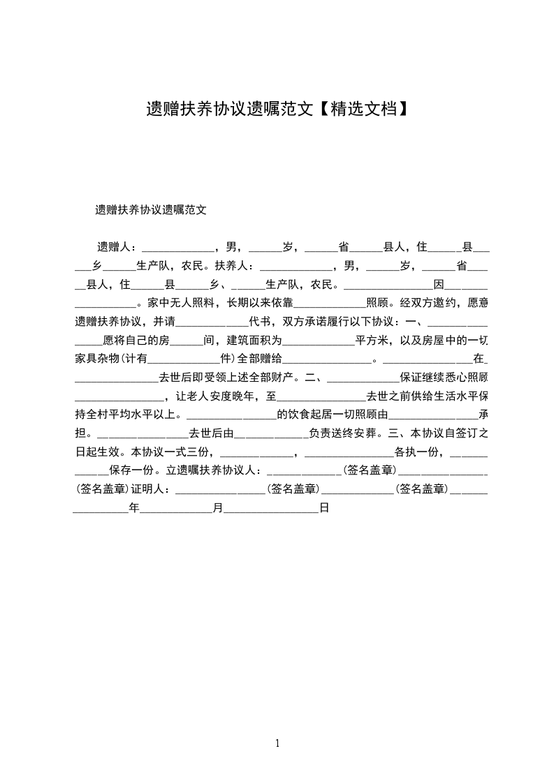 遗赠人:_____________,男,______岁,______省______县人,住______县______乡______生产队,农民。 扶养人:_____________,男,______岁,______省______县人,住______县______乡、______生产队,农民。 ________________因___________________。家中无人照料,长期以来依靠_____________照顾。经双方邀约,愿意遗赠扶养协议,并请_____________代书,双方承诺履行以下协议: 一、________________愿将自己的房______间,建筑面积为_____________平方米,以及房屋中的一切家具杂物(计有_____________件)全部赠给________________。________________在________________去世后即受领上述全部财产。 二、_____________保证继续悉心照顾________________,让老人安度晚年,至________________去世之前供给生活水平保持全村平均水平以上。________________的饮食起居一切照顾由________________承担。________________去世后由_____________负责送终安葬。 三、本协议自签订之日起生效。 本协议一式三份,_____________,________________各执一份,_____________保存一份。 立遗嘱扶养协议人:_____________(签名盖章) ________________(签名盖章) 证明人:________________(签名盖章) _____________(签名盖章) _________________年_____________月_________________日