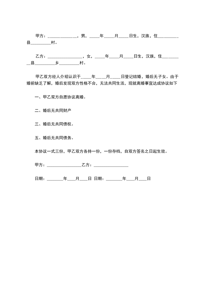 甲乙双方经人介绍认识于_____年_____月_____日登记结婚,婚后无子女。由于婚前缺乏了解,婚后发现双方性格不合,无法共同生活,现就离婚事宜达成协议如下: