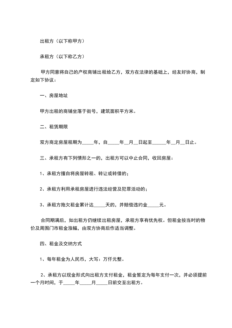 甲方同意将自己的产权商铺出租给乙方,双方在法律的基础上,经友好协商,制定如下协议: