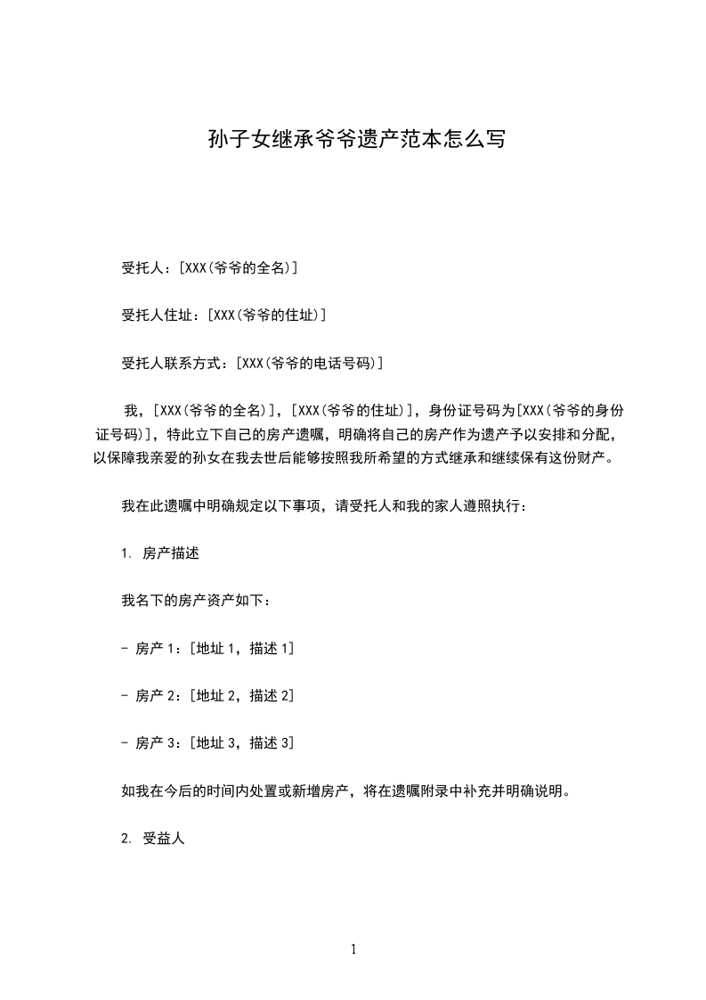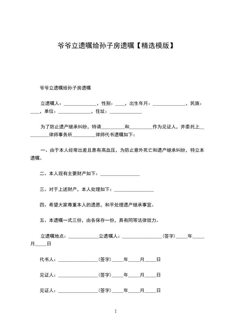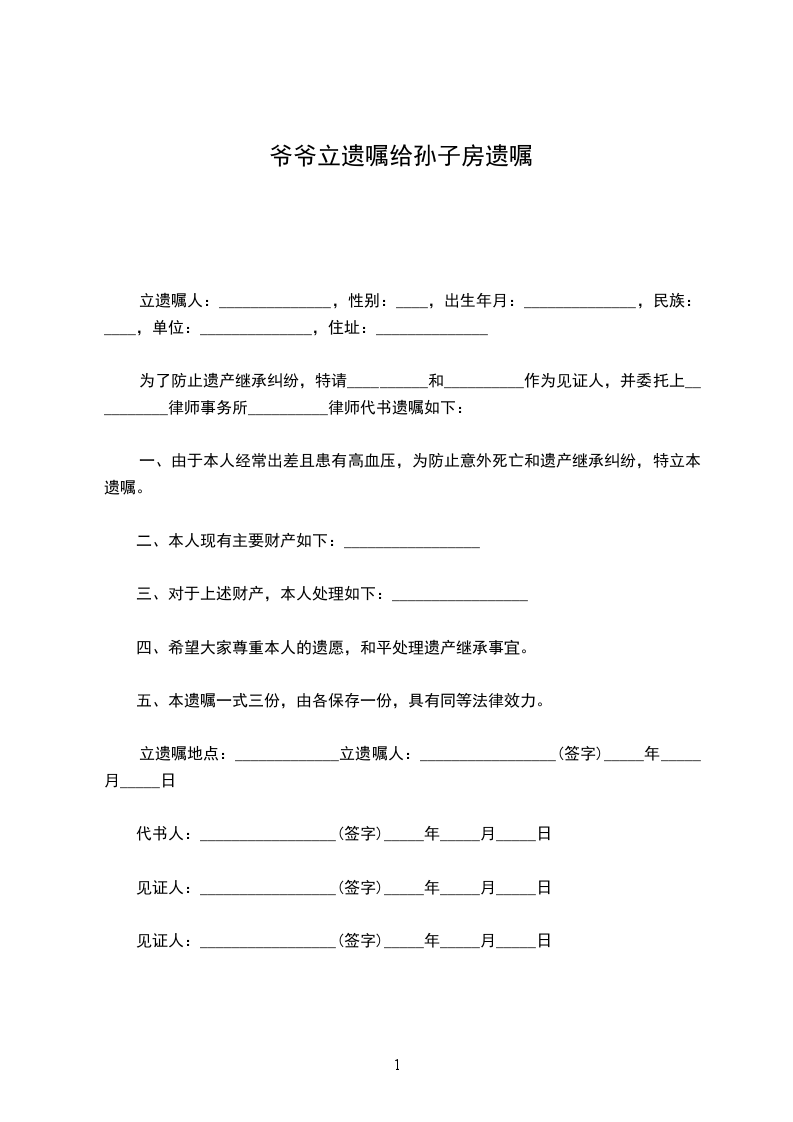 一、由于本人经常出差且患有高血压,为防止意外死亡和遗产继承纠纷,特立本遗嘱。
