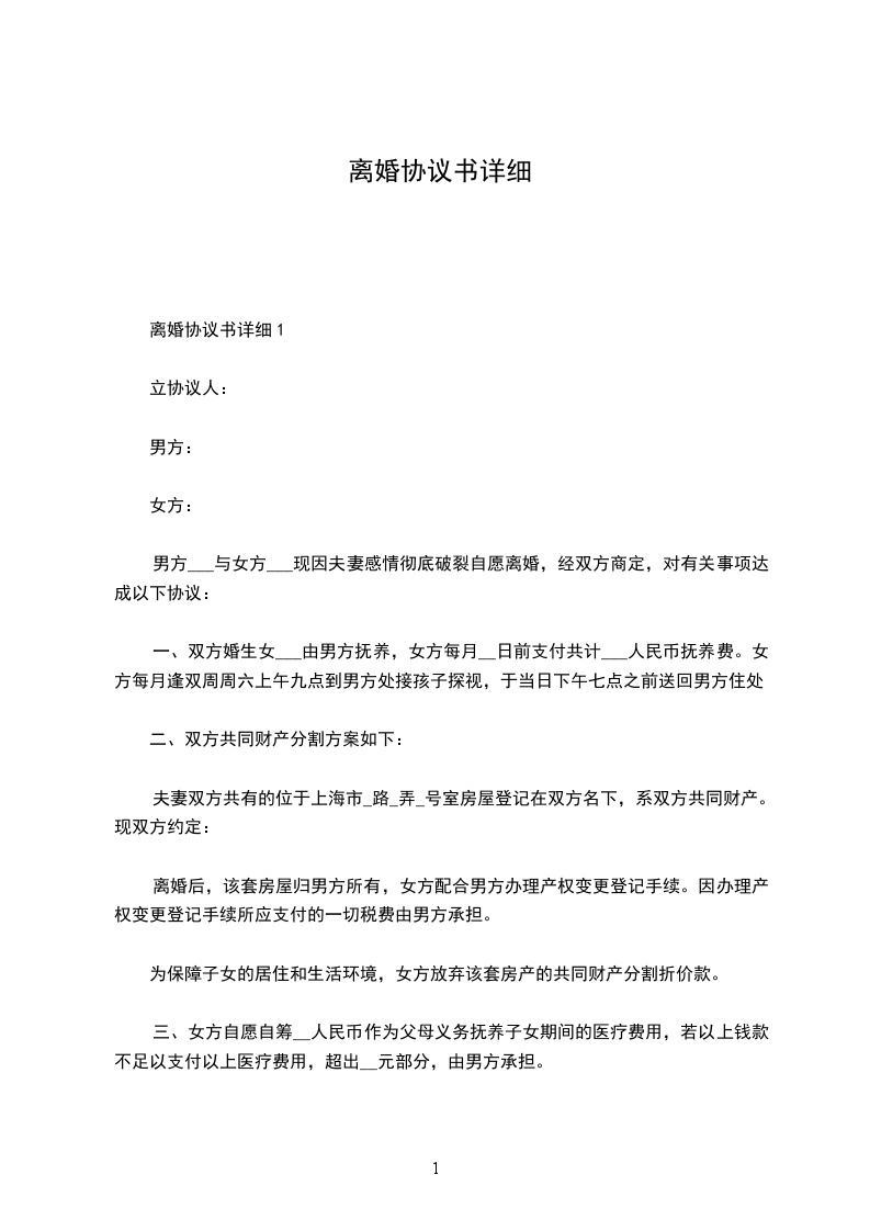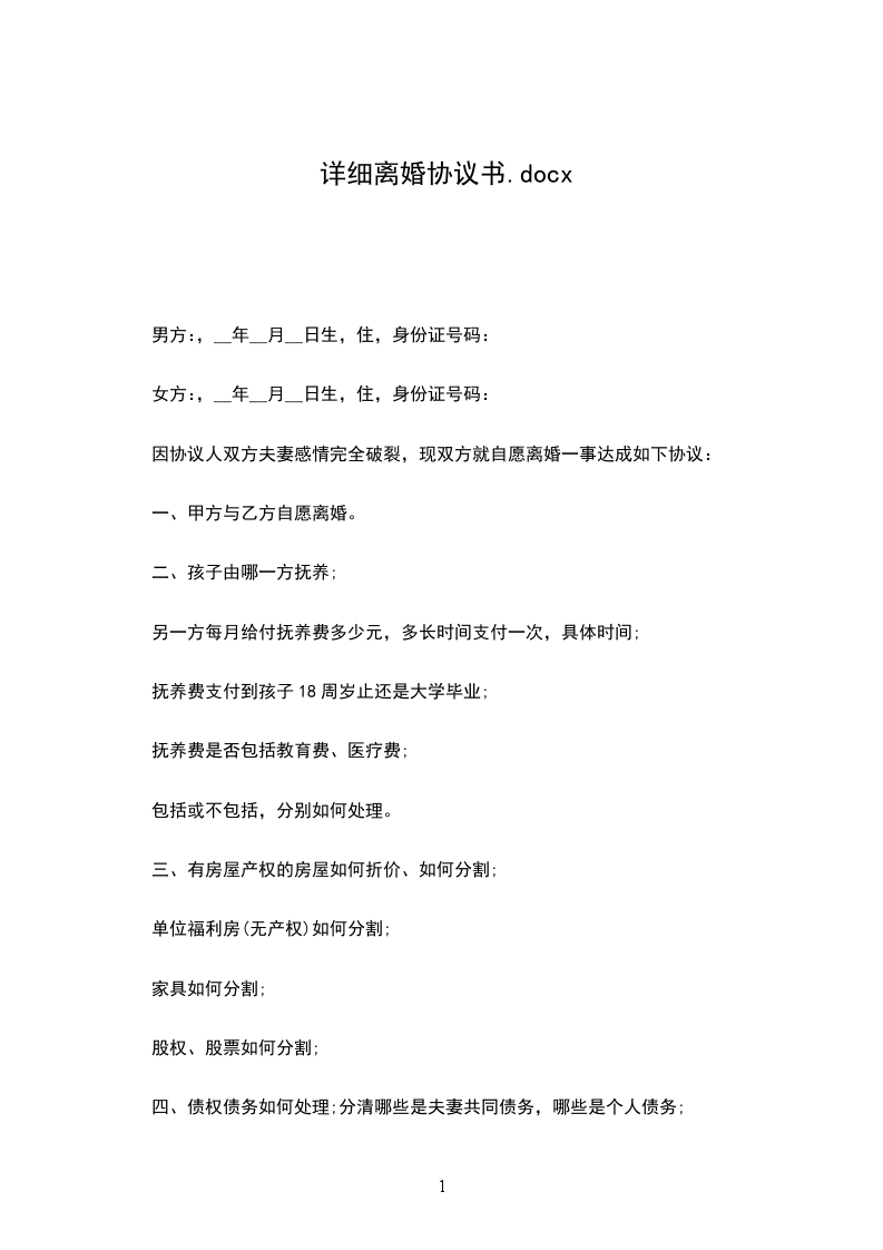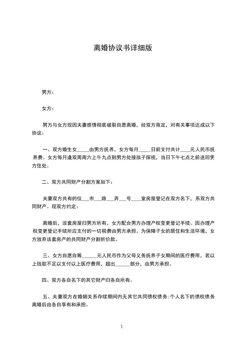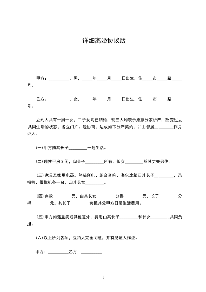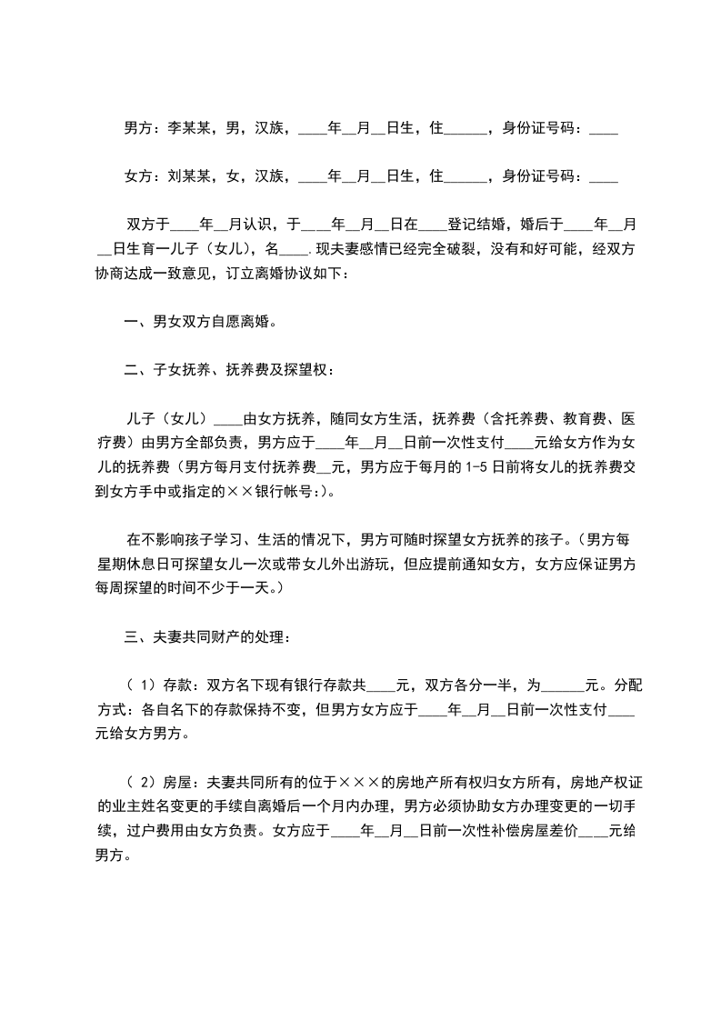 双方于____年__月认识,于____年__月__日在____登记结婚,婚后于____年__月__日生育一儿子(女儿),名____.现夫妻感情已经完全破裂,没有和好可能,经双方协商达成一致意见,订立离婚协议如下:
