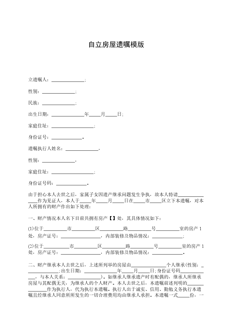 立遗嘱人:______________; 性别:______________; 民族:______________; 出生日期:______________年_____月_____日; 家庭住址:__________________; 身份证号:_____________。 遗嘱执行人姓名:______________, 性别:______________, 家庭住址:__________________; 身份证号码:_____________。 由于担心本人去世之后,家属子女因遗产继承问题发生争执,故本人特请_______________作为见证人,本人于_____年_____月_____日在_____市_____区立下本遗嘱,对本人所拥有的财产作出如下处理: 一、财产情况本人名下目前共拥有房产【】处,其具体情况如下: (1)位于__________市__________区__________路__________号__________室的房产1处,房产证号:_________________,内部装修及物品情况:_____________; (2)位于___________市__________区__________路__________号__________室的房产1处,房产证号:_________________,内部装修及物品情况:_____________。 二、财产继承本人去世之后,上述所列举的房屋由_______________个人继承(性别:______________;出生日期:______________年_____月_____日;身份证号码_____________,与本人关系:______________)。如继承人继承遗产时有配偶的,继承人所继承房屋与其配偶无关,为继承人的个人财产。本人去世之后,本遗嘱前述列明的_______________作为执行人,代为执行本遗嘱。执行人出于诚实、信用、勤勉义务执行本遗嘱且经继承人同意所所发生的一切合理费用均由继承人承担。本遗嘱一式_____份,一份交_______________,一份交_______________。本人在此明确,订立本遗嘱期间本人神智清醒且就订立该遗嘱未受到任何胁迫、欺诈,上述遗嘱为本人自愿作出,是本人内心真实意思的表示。本人其他亲属或任何第三人均不得以任何理由对继承人继承本人所有的上述房屋进行干涉。 见证人(签字):______________ 立遗嘱人(签字):______________ 日期:______________年_____月_____日