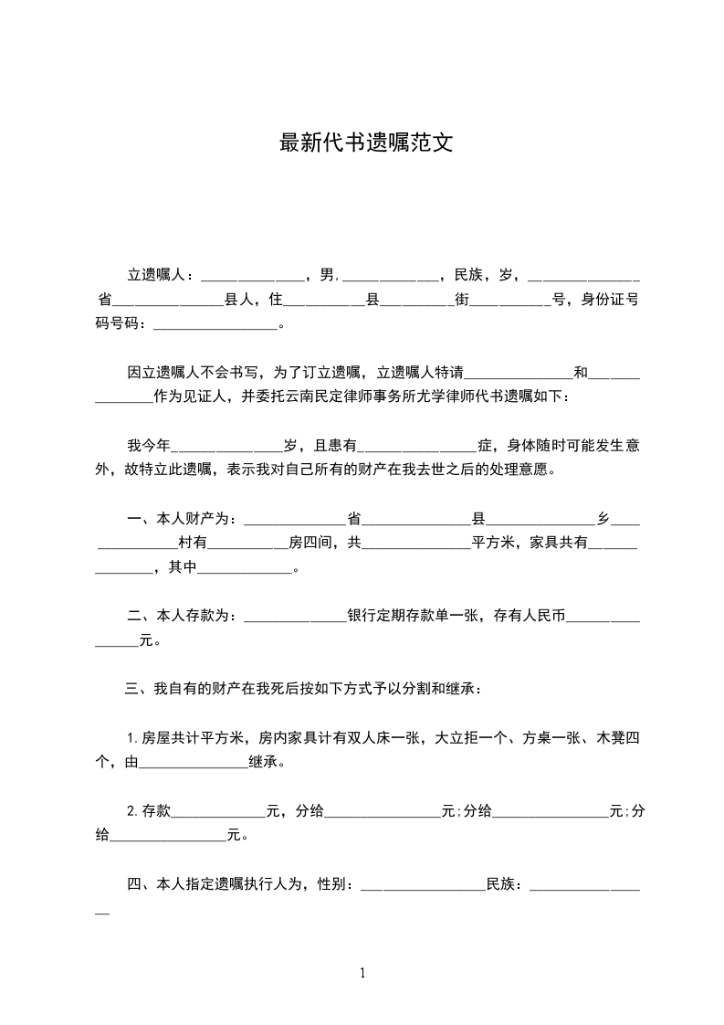 因立遗嘱人不会书写,为了订立遗嘱,立遗嘱人特请_______________和_______________作为见证人,并委托云南民定律师事务所尤学律师代书遗嘱如下:
