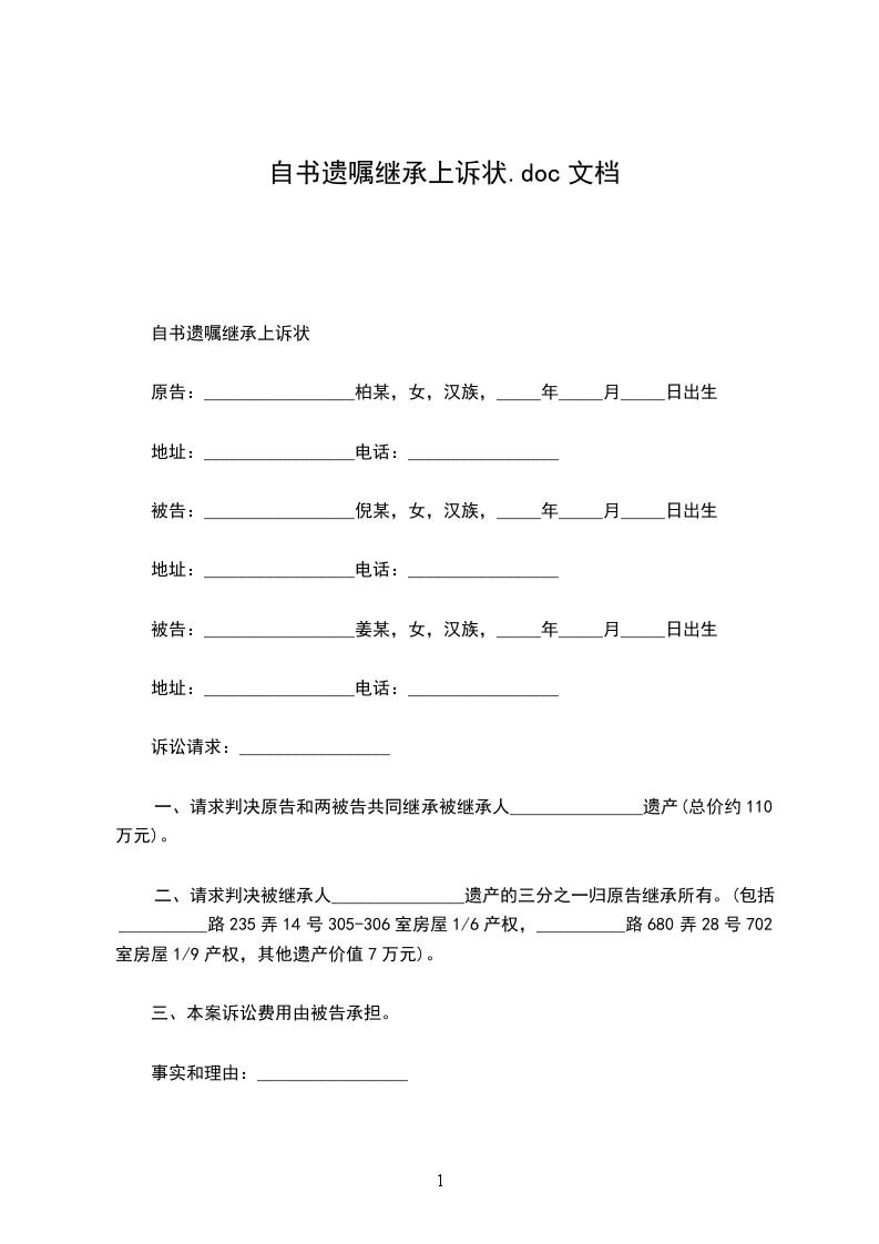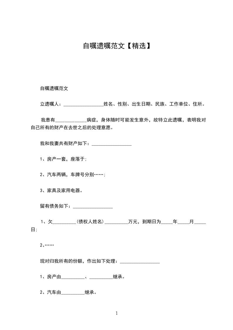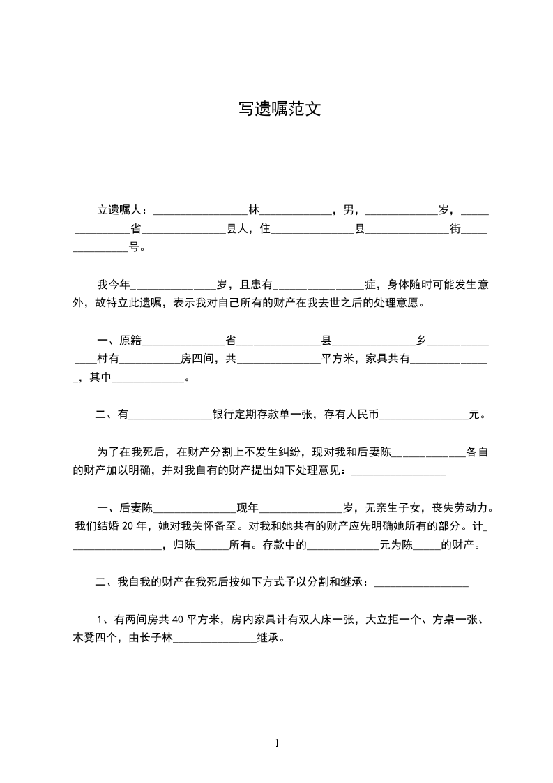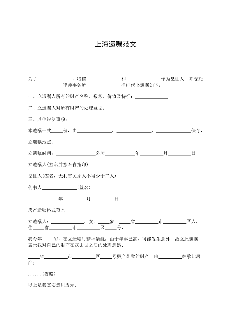 为了_______________,特请_______________和_______________作为见证人,并委托_______________律师事务所_______________律师代书遗嘱如下: 一、立遗嘱人所有的财产名称、数额、价值及特征:______________ 二、立遗嘱人对所有财产的处理意见:______________ 三、其他说明事项: 本遗嘱一式_____份,由_______________、_______________、_______________保存。 立遗嘱地点:______________ 立遗嘱时间:_________________公历_____________年__________月__________日 立遗嘱人(签名并捺右食指印) 见证人(签名,无利害关系人不得少于二人) 代书人_______________(签名) _____________年__________月__________日 房产遗嘱格式范本 立遗嘱人:______________,女,_____岁,_____省__________市__________区人,住_____省__________市__________区_____号。 我今年_____岁,在立遗嘱时精神清醒,由于年事已高,可能发生意外,故立此遗嘱,表示我对自己的财产在我去世之后的处理意愿。 _____省__________市__________区_____号房产是我的财产,由__________继承此房产; ......(省略) 以上是我真实意思表示。 遗嘱执行人:_________________. 本遗嘱一式三份,分别有__________、__________、_____各执一份。 立遗嘱人__________(盖章、按手印) 见证人:_________________(签名盖章)