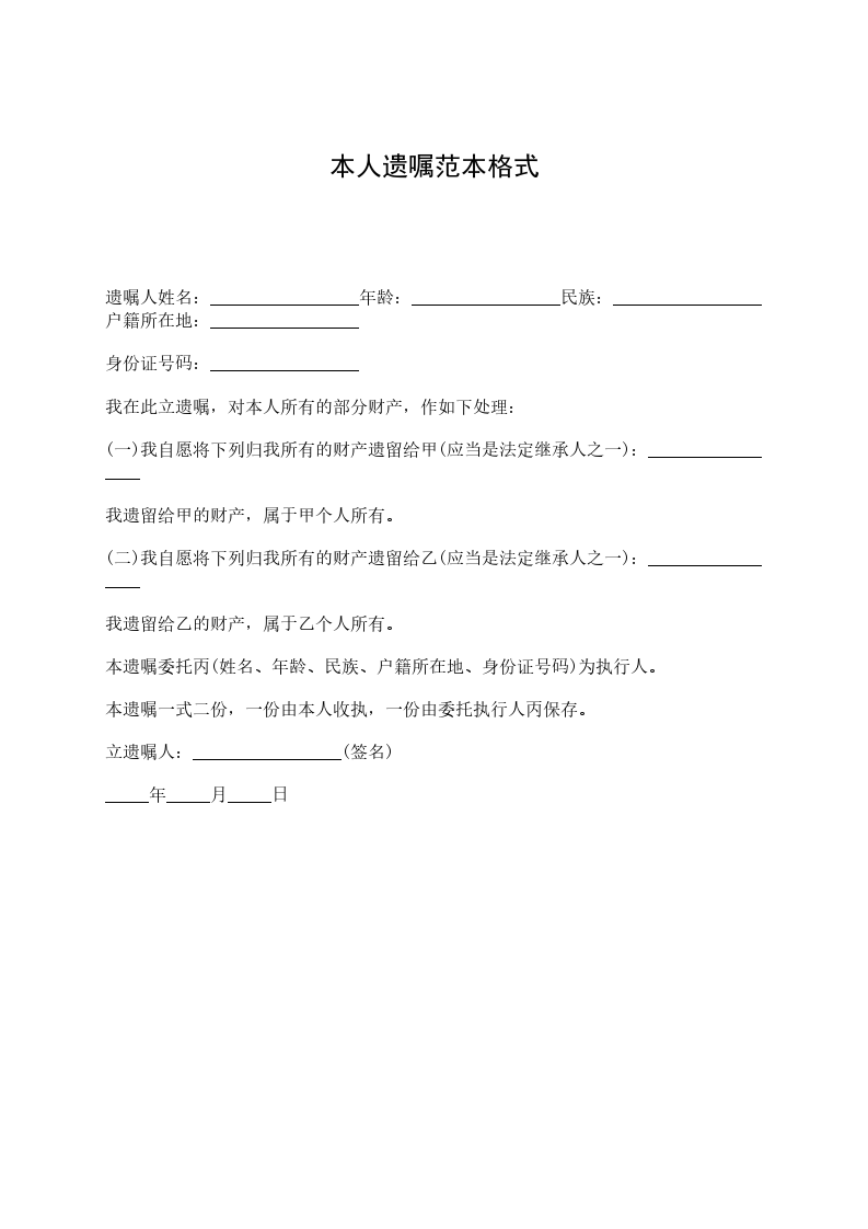 遗嘱人姓名:_________________年龄:_________________民族:_________________户籍所在地:_________________ 身份证号码:_________________ 我在此立遗嘱,对本人所有的部分财产,作如下处理: (一)我自愿将下列归我所有的财产遗留给甲(应当是法定继承人之一):_________________ 我遗留给甲的财产,属于甲个人所有。 (二)我自愿将下列归我所有的财产遗留给乙(应当是法定继承人之一):_________________ 我遗留给乙的财产,属于乙个人所有。 本遗嘱委托丙(姓名、年龄、民族、户籍所在地、身份证号码)为执行人。 本遗嘱一式二份,一份由本人收执,一份由委托执行人丙保存。 立遗嘱人:_________________(签名) _____年_____月_____日