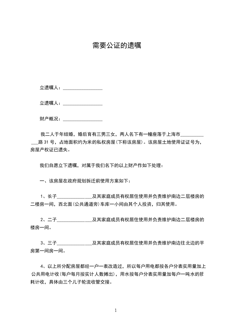 我二人于年结婚,婚后育有三男三女,两人名下有一幢座落于上海市_____________路31号,占地面积约为米的私权房屋(下称该房屋)。该房屋土地使用证证号为,房屋产权证已遗失。
