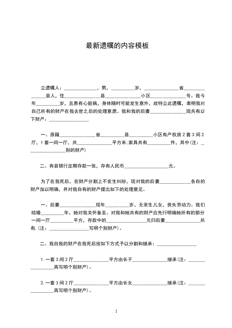 1.一套3间2厅_______________平方由长子_______________继承(注:_________________再写明个别财产)。