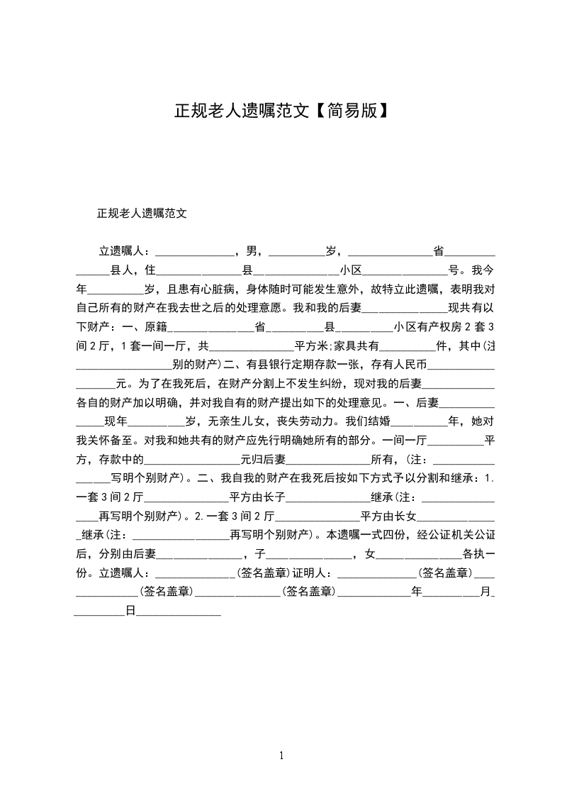 立遗嘱人:______________,男,__________岁,_______________省_______________县人,住_______________县_______________小区_______________号。我今年__________岁,且患有心脏病,身体随时可能发生意外,故特立此遗嘱,表明我对自己所有的财产在我去世之后的处理意愿。我和我的后妻_______________现共有以下财产: 一、原籍_______________省__________县__________小区有产权房2套3间2厅,1套一间一厅,共_______________平方米;家具共有__________件,其中(注:_________________别的财产) 二、有县银行定期存款一张,存有人民币___________________元。 为了在我死后,在财产分割上不发生纠纷,现对我的后妻_____________各自的财产加以明确,并对我自有的财产提出如下的处理意见。 一、后妻_______________现年__________岁,无亲生儿女,丧失劳动力。我们结婚__________年,她对我关怀备至。对我和她共有的财产应先行明确她所有的部分。一间一厅__________平方,存款中的_________________元归后妻_______________所有,(注:_________________写明个别财产)。 二、我自我的财产在我死后按如下方式予以分割和继承: 1.一套3间2厅_______________平方由长子_______________继承(注:_________________再写明个别财产)。 2.一套3间2厅_______________平方由长女_______________继承(注:_________________再写明个别财产)。 本遗嘱一式四份,经公证机关公证后,分别由后妻_______________,子_______________,女_______________各执一份。 立遗嘱人:______________(签名盖章) 证明人:______________(签名盖章) _______________(签名盖章) _______________(签名盖章) _____________年__________月__________日_______________