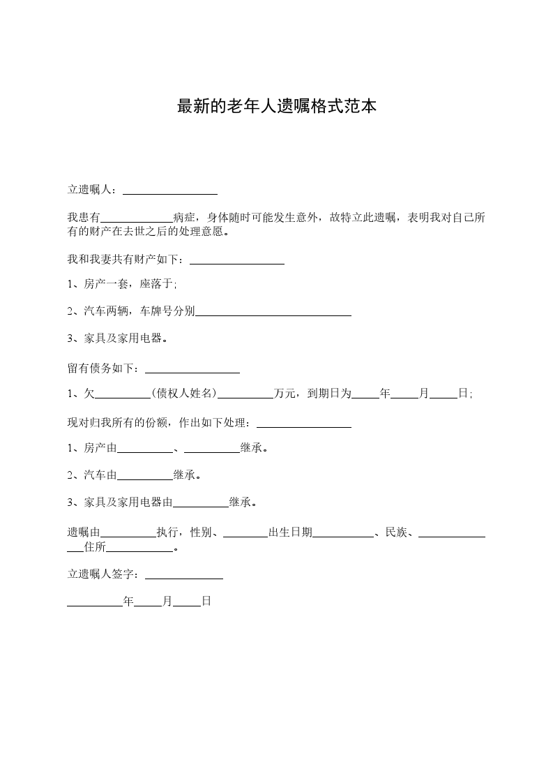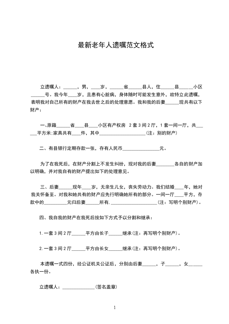 立遗嘱人:_________________,女,汉族,________年____月____日生,住济南市__________号。身份证号:_________________由于本人年事已高,为了明确我去世后我名下拥有的房产份额分割问题,现特立此遗嘱。本人__________与__________(现在已经去世,身份证号为__________)系夫妻关系,我夫妻二人名下共有房产一套,该房产坐落为区街号楼室;房屋面积为:_________________平方米;房屋权属登记证号为:_________________。现我决定将我对该房产所拥有的份额进行如下处理:我去世后该房产由__________(身份证号)一人继承。本遗嘱一式两份,本人和继承人各执一份。 立遗嘱人:_________________ ________年____月____日 见证人:_________________身份证号:_________________电话:_________________ 见证人:_________________身份证号:_________________电话:_________________ 代书人:_________________身份证号:_________________电话:_________________
