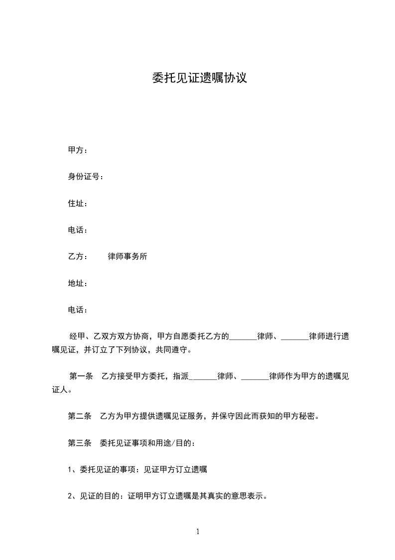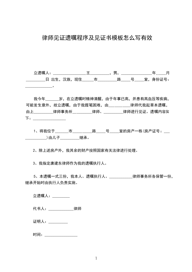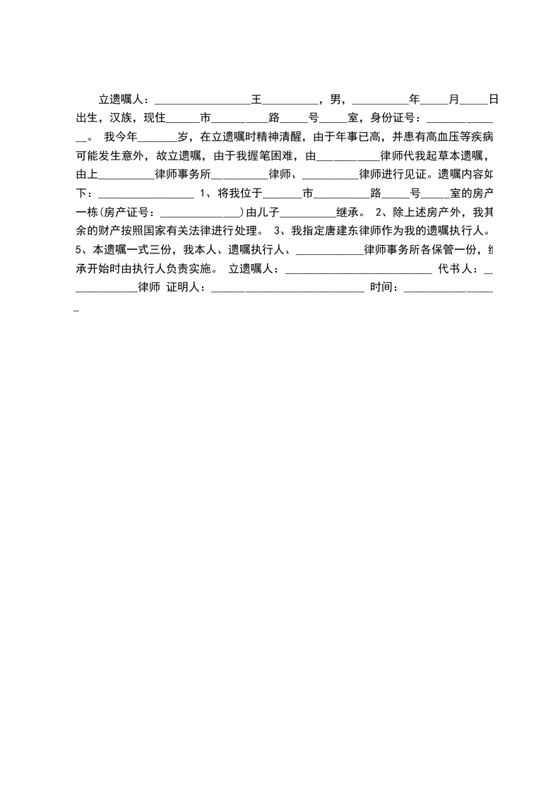 立遗嘱人:_________________王__________,男,__________年_____月_____日出生,汉族,现住______市__________路_____号_____室,身份证号:______________。 我今年_______岁,在立遗嘱时精神清醒,由于年事已高,并患有高血压等疾病,可能发生意外,故立遗嘱,由于我握笔困难,由___________律师代我起草本遗嘱,由上__________律师事务所__________律师、__________律师进行见证。遗嘱内容如下:_________________ 1、将我位于_______市__________路_____号_____室的房产一栋(房产证号:______________)由儿子__________继承。 2、除上述房产外,我其余的财产按照国家有关法律进行处理。 3、我指定唐建东律师作为我的遗嘱执行人。 5、本遗嘱一式三份,我本人、遗嘱执行人、____________律师事务所各保管一份,继承开始时由执行人负责实施。 立遗嘱人:__________________________ 代书人:_____________律师 证明人:___________________________ 时间:_________________