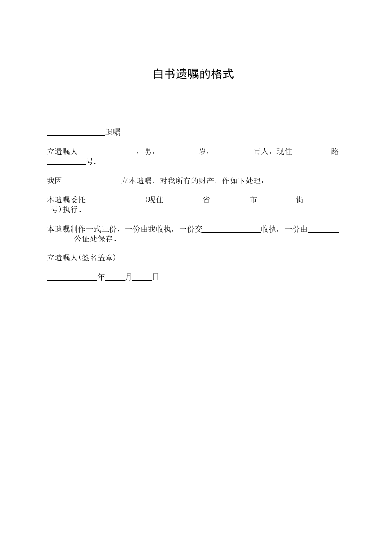 _______________遗嘱 立遗嘱人_______________,男,__________岁,__________市人,现住__________路__________号。 我因_______________立本遗嘱,对我所有的财产,作如下处理:_________________ 本遗嘱委托_______________(现住__________省__________市__________街__________号)执行。 本遗嘱制作一式三份,一份由我收执,一份交_______________收执,一份由_______________公证处保存。 立遗嘱人(签名盖章) _____________年_____月_____日