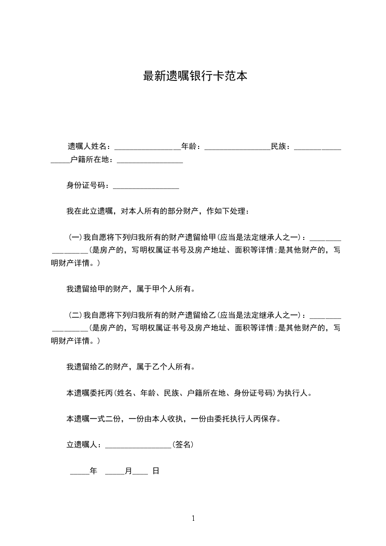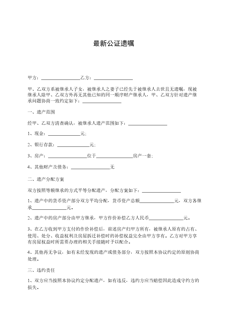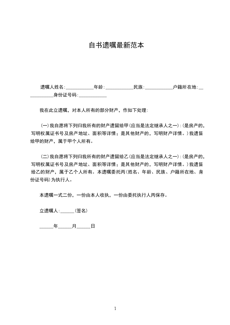 _______________遗嘱 立遗嘱人_______________,男,__________岁,__________市人,现住__________路__________号。 我因_______________立本遗嘱,对我所有的财产,作如下处理:_________________ 本遗嘱委托_______________(现住__________省__________市__________街__________号)执行。 本遗嘱制作一式三份,一份由我收执,一份交_______________收执,一份由_______________公证处保存。 立遗嘱人(签名盖章) _____________年_____月_____日