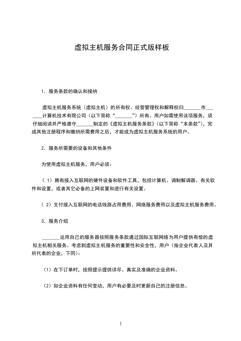 虚拟主机服务系统(虚拟主机)的所有权、经营管理权和解释权归_______市_______计算机技术有限公司(以下简称“_______”)所有。用户如需使用该项服务,须仔细阅读并严格遵守_______制定的《虚拟主机服务条款》(以下简称“本条款”),完成其他注册程序和缴纳所需费用之后,才能成为虚拟主机服务系统的用户。