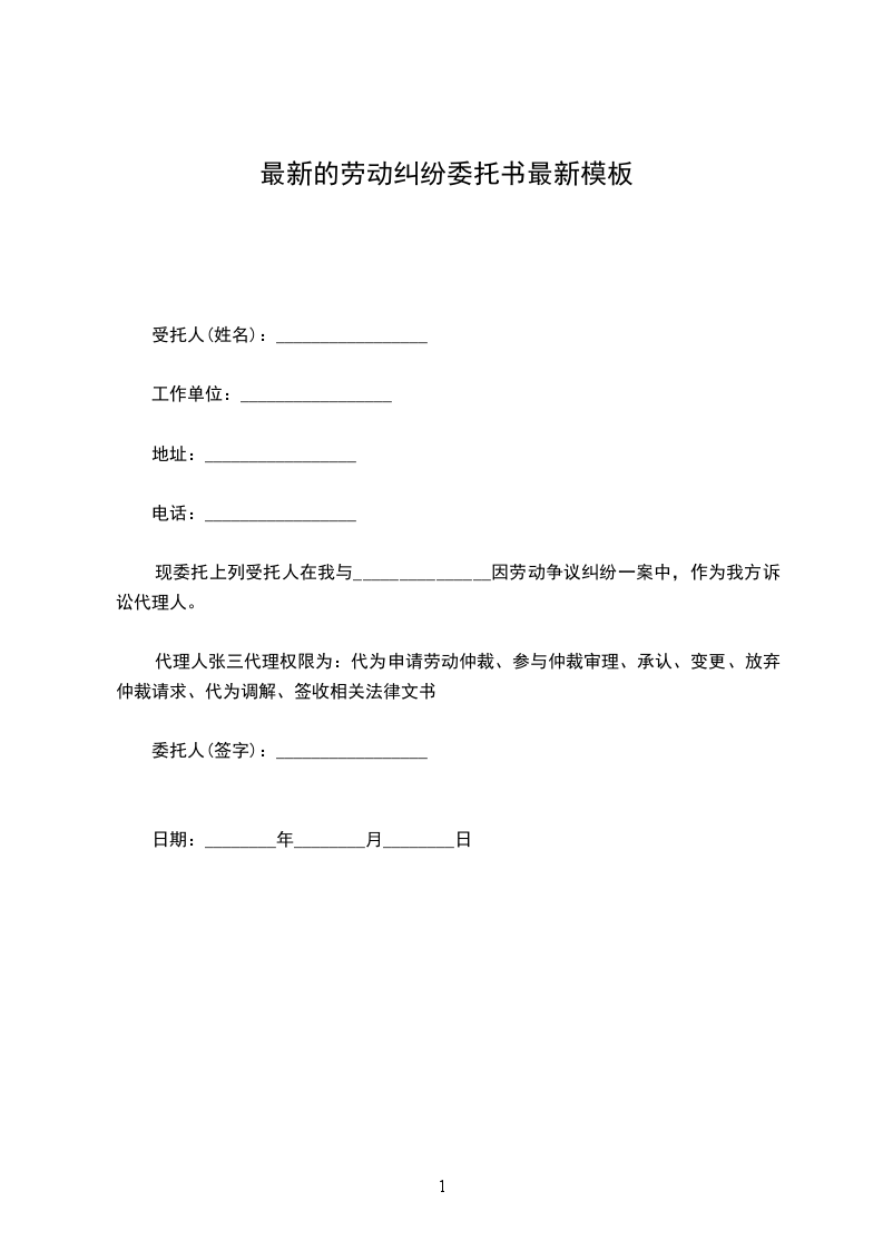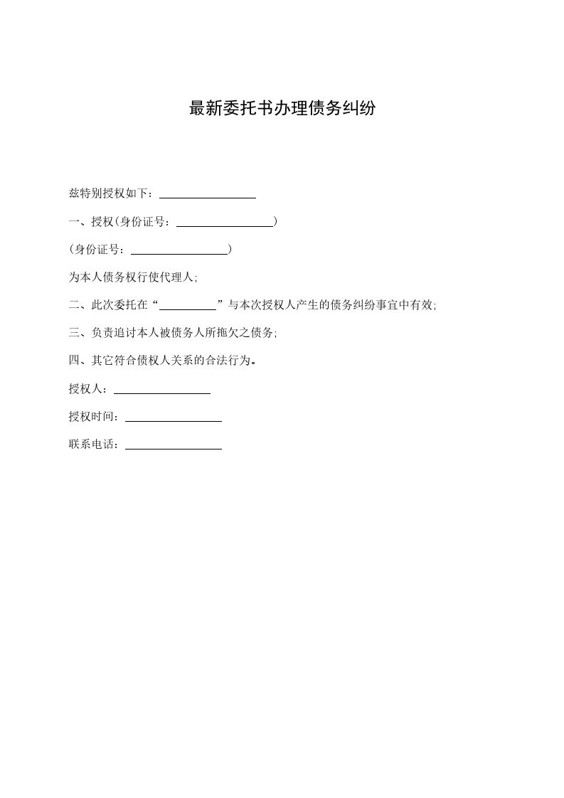 兹特别授权如下:_________________ 一、授权(身份证号:_________________) (身份证号:_________________) 为本人债务权行使代理人; 二、此次委托在“__________”与本次授权人产生的债务纠纷事宜中有效; 三、负责追讨本人被债务人所拖欠之债务; 四、其它符合债权人关系的合法行为。 授权人:_________________ 授权时间:_________________ 联系电话:_________________