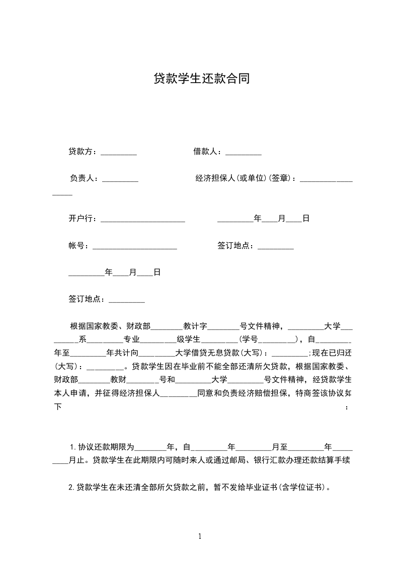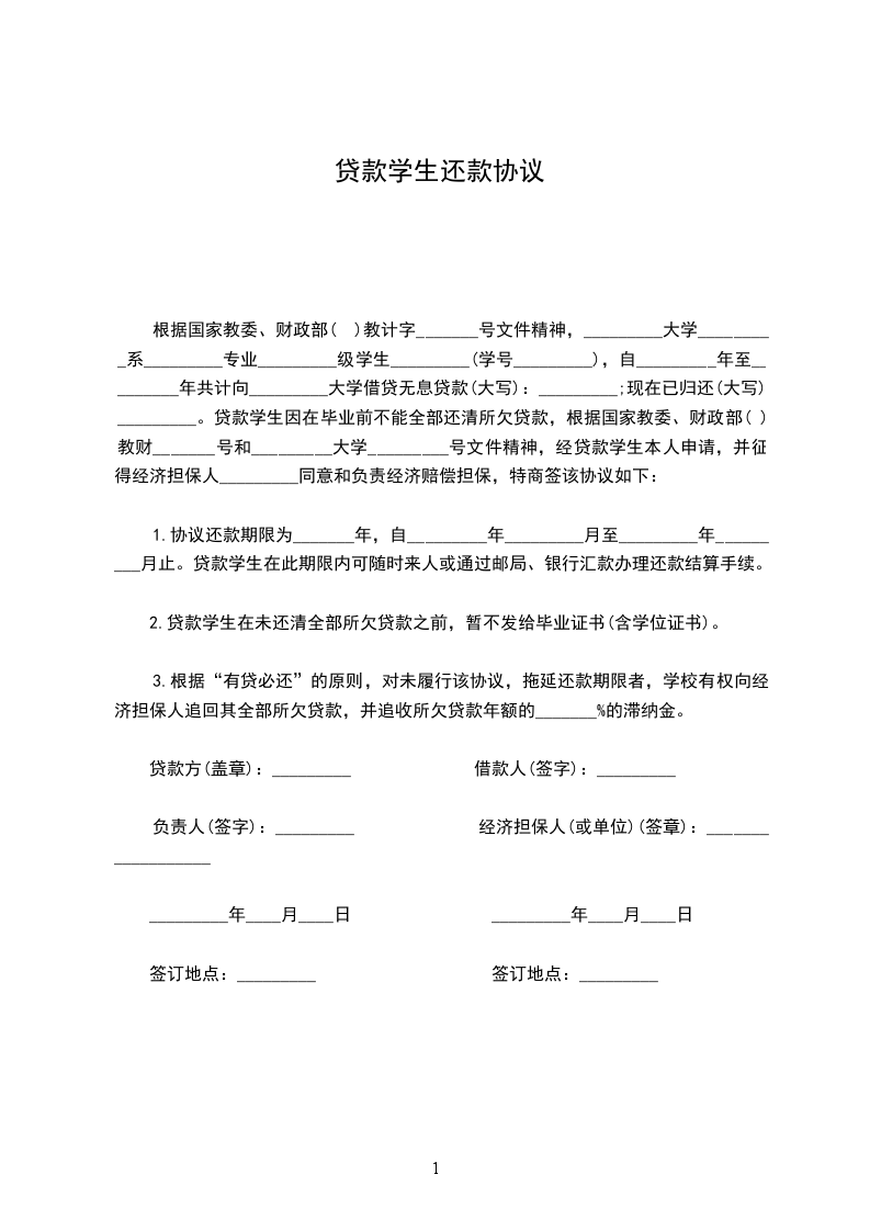 1、协议还款期限为一年,自______年______月至______年______月止。贷款学生在此期间内可随时来人或通过邮局、银行汇款办理还款结算手续。