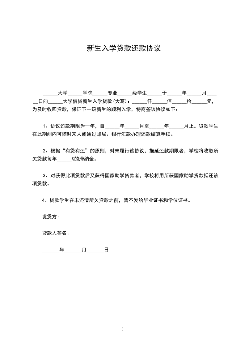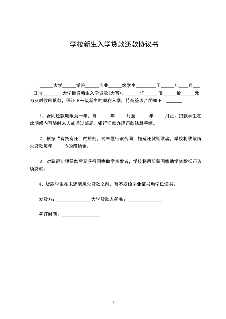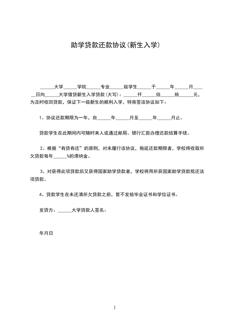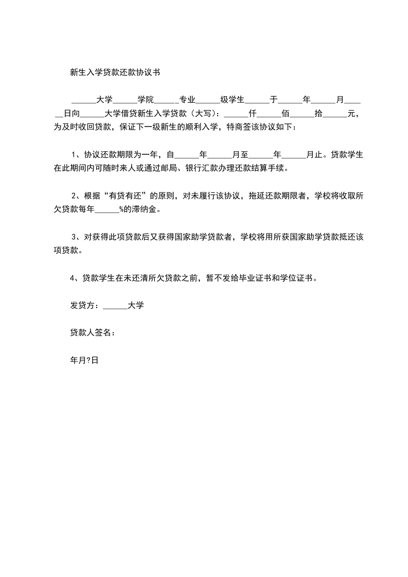 ______大学______学院______专业______级学生______于______年______月______日向______大学借贷新生入学贷款(大写):______仟______佰______拾______元,为及时收回贷款,保证下一级新生的顺利入学,特商签该协议如下: