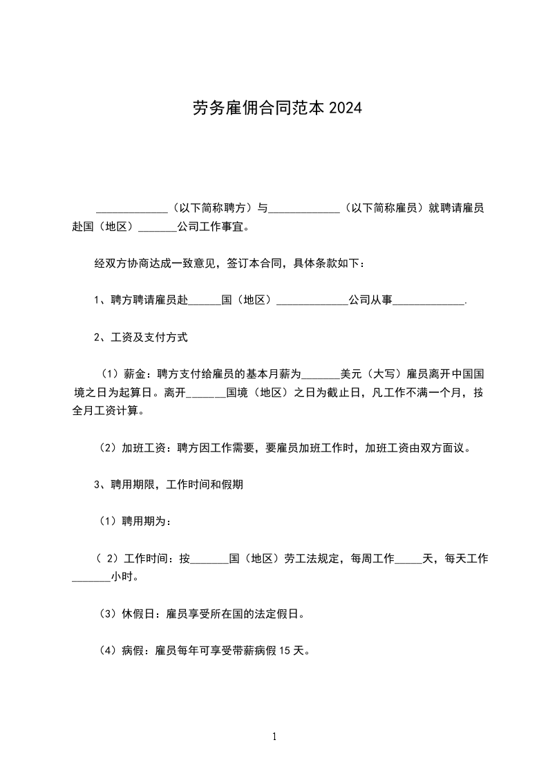1、聘方聘请雇员赴______国(地区)_____________公司从事_____________.