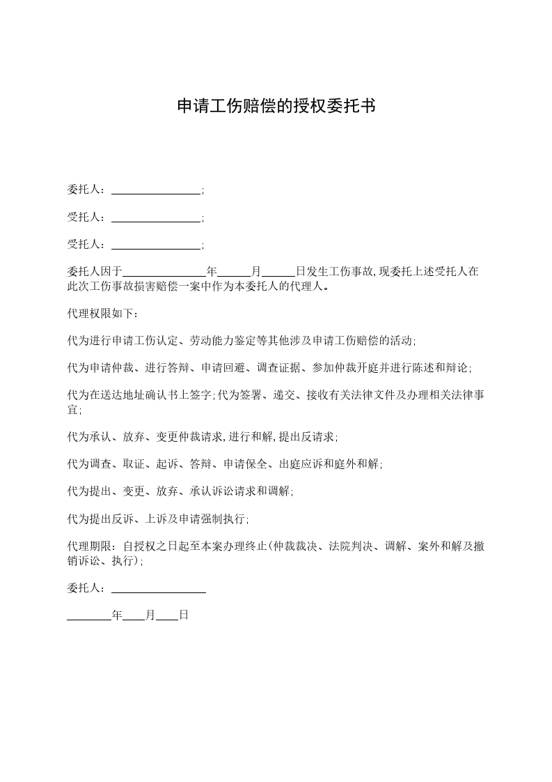 委托人:________________; 受托人:________________; 受托人:________________; 委托人因于_______________年______月______日发生工伤事故,现委托上述受托人在此次工伤事故损害赔偿一案中作为本委托人的代理人。 代理权限如下: 代为进行申请工伤认定、劳动能力鉴定等其他涉及申请工伤赔偿的活动; 代为申请仲裁、进行答辩、申请回避、调查证据、参加仲裁开庭并进行陈述和辩论; 代为在送达地址确认书上签字;代为签署、递交、接收有关法律文件及办理相关法律事宜; 代为承认、放弃、变更仲裁请求,进行和解,提出反请求; 代为调查、取证、起诉、答辩、申请保全、出庭应诉和庭外和解; 代为提出、变更、放弃、承认诉讼请求和调解; 代为提出反诉、上诉及申请强制执行; 代理期限:自授权之日起至本案办理终止(仲裁裁决、法院判决、调解、案外和解及撤销诉讼、执行); 委托人:_________________ ________年____月____日