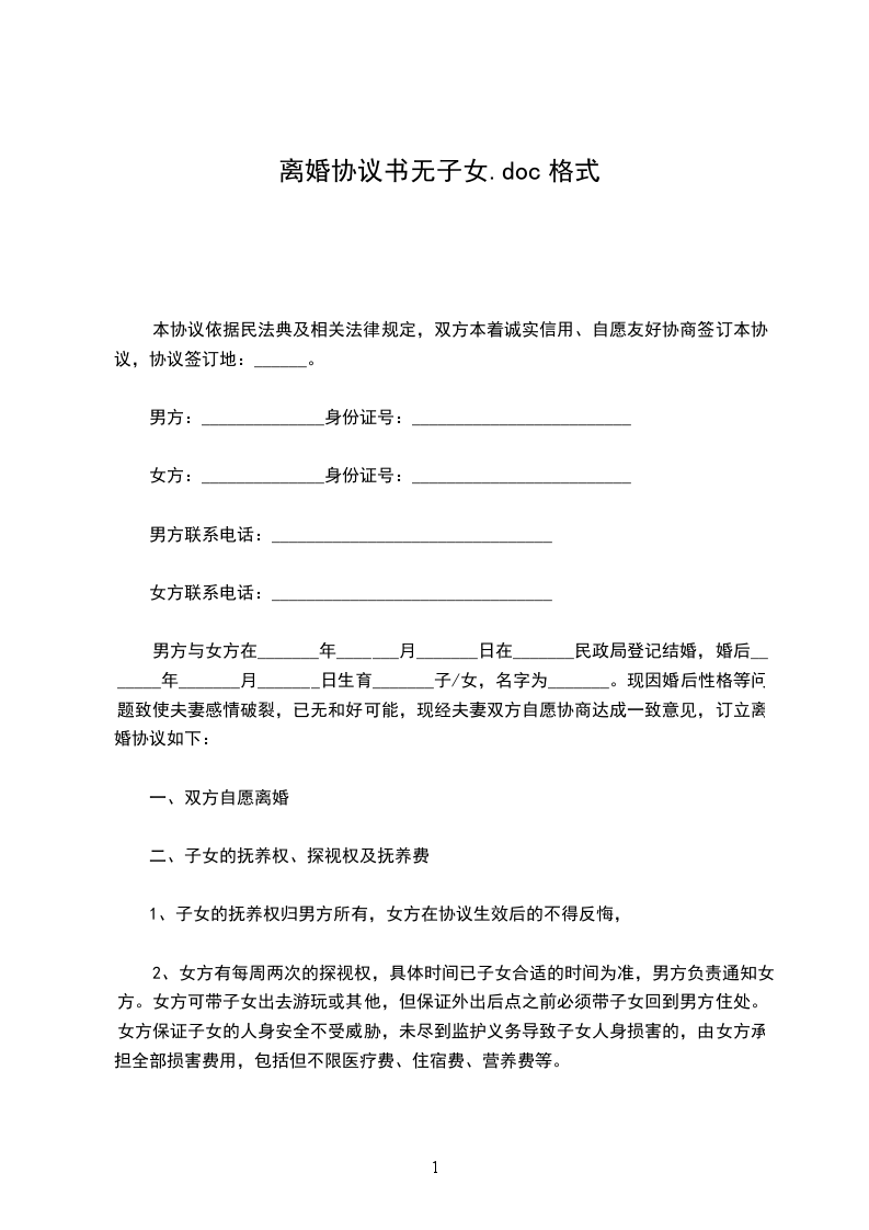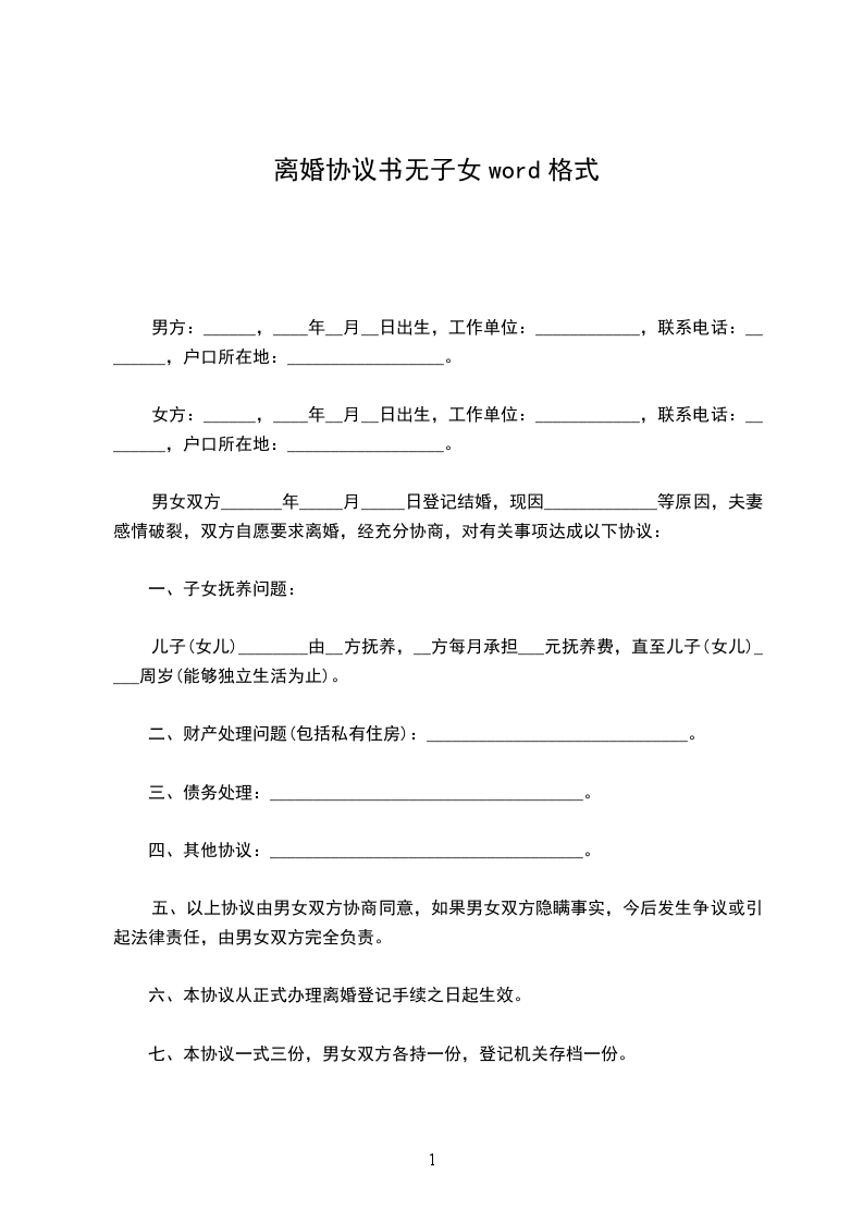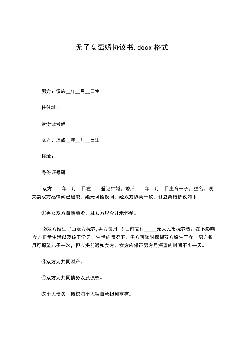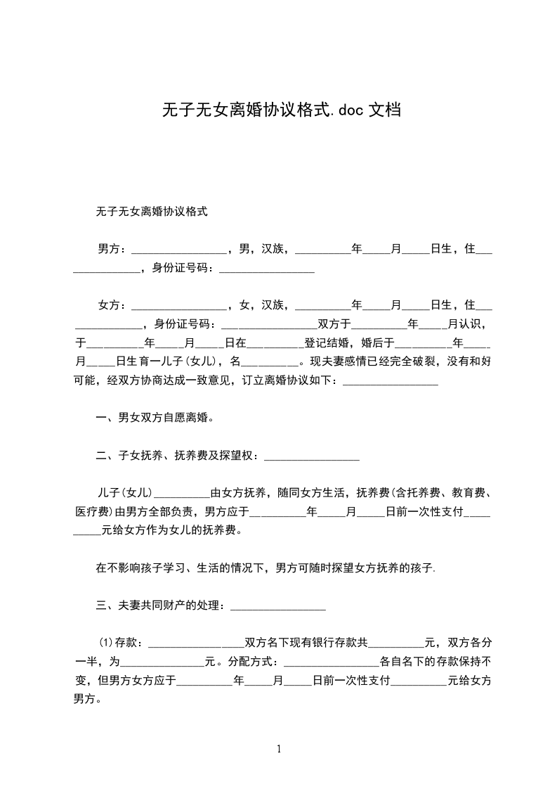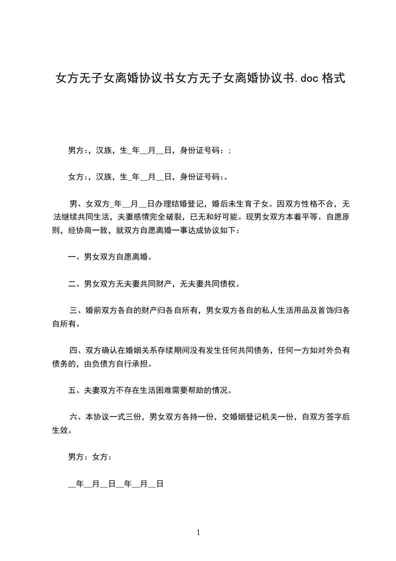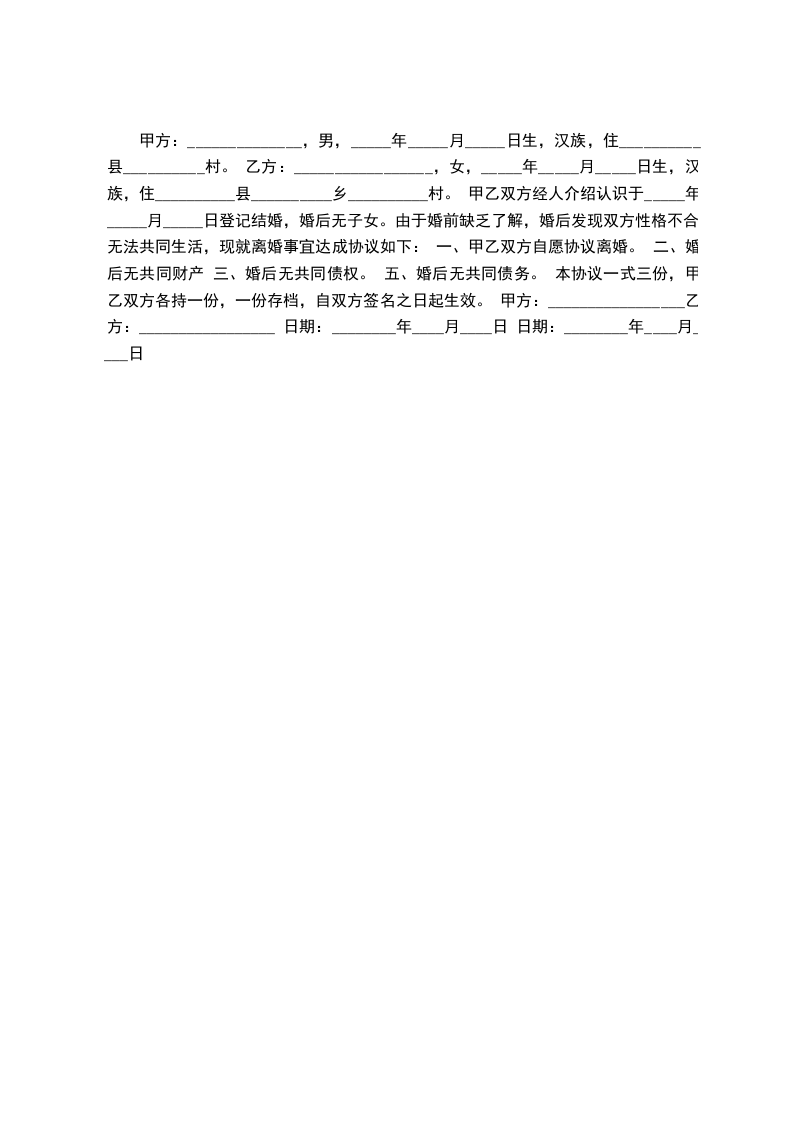 甲方:______________,男,_____年_____月_____日生,汉族,住__________县__________村。 乙方:_________________,女,_____年_____月_____日生,汉族,住__________县__________乡__________村。 甲乙双方经人介绍认识于_____年_____月_____日登记结婚,婚后无子女。由于婚前缺乏了解,婚后发现双方性格不合,无法共同生活,现就离婚事宜达成协议如下: 一、甲乙双方自愿协议离婚。 二、婚后无共同财产 三、婚后无共同债权。 五、婚后无共同债务。 本协议一式三份,甲乙双方各持一份,一份存档,自双方签名之日起生效。 甲方:_________________乙方:_________________ 日期:________年____月____日 日期:________年____月____日