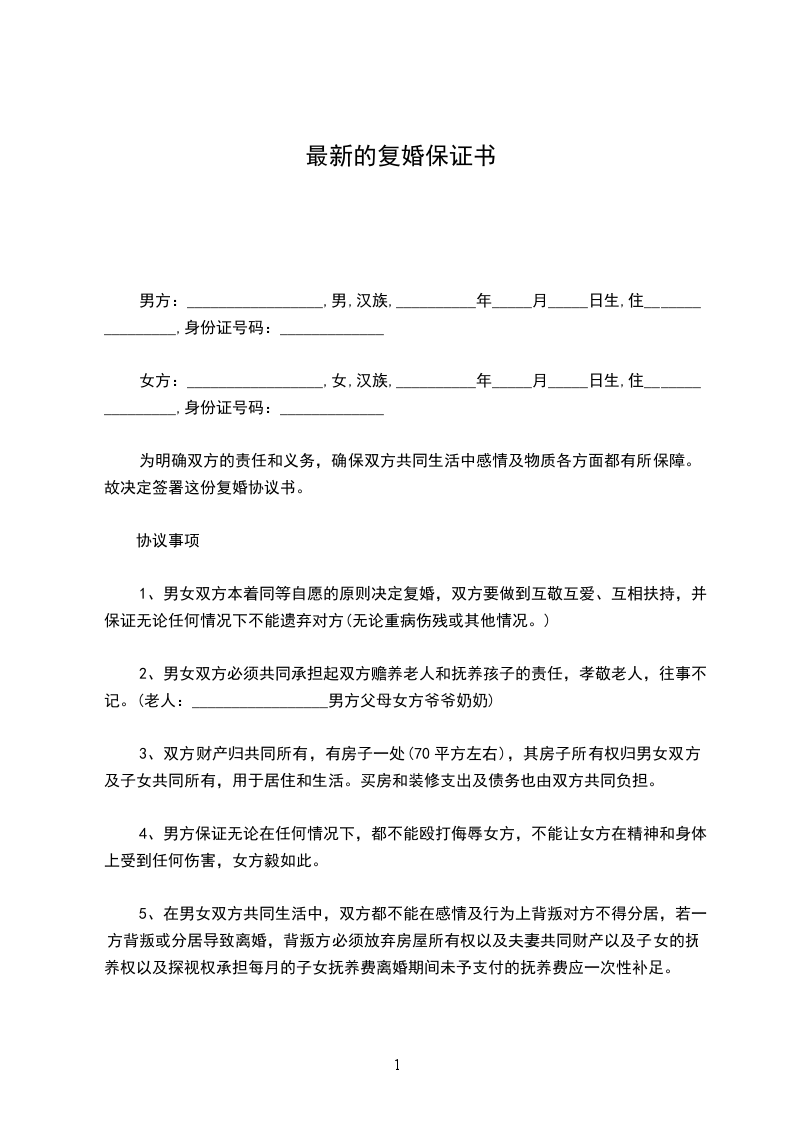 1、男女双方本着同等自愿的原则决定复婚,双方要做到互敬互爱、互相扶持,并保证无论任何情况下不能遗弃对方(无论重病伤残或其他情况。)