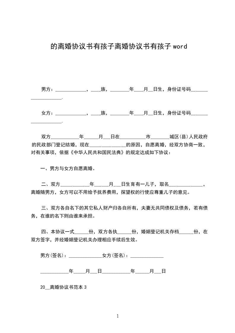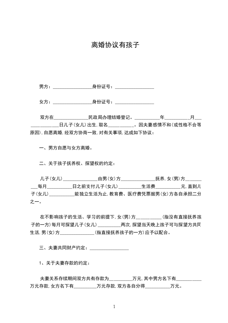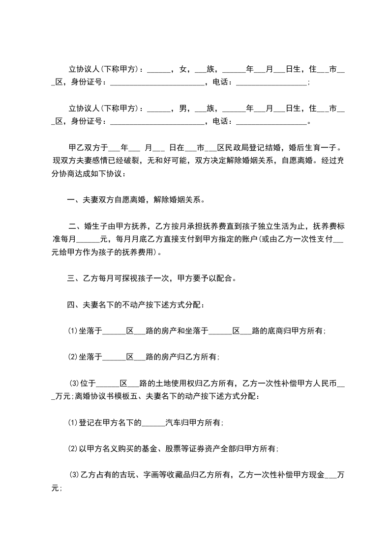 双方在_______________民政局办理结婚登记。___________年___________月_______________日儿子(女儿)出生,取名___________。因夫妻感情不和(或性格不合等原因),自愿离婚,经双方协商一致,对有关事项,达成如下协议: