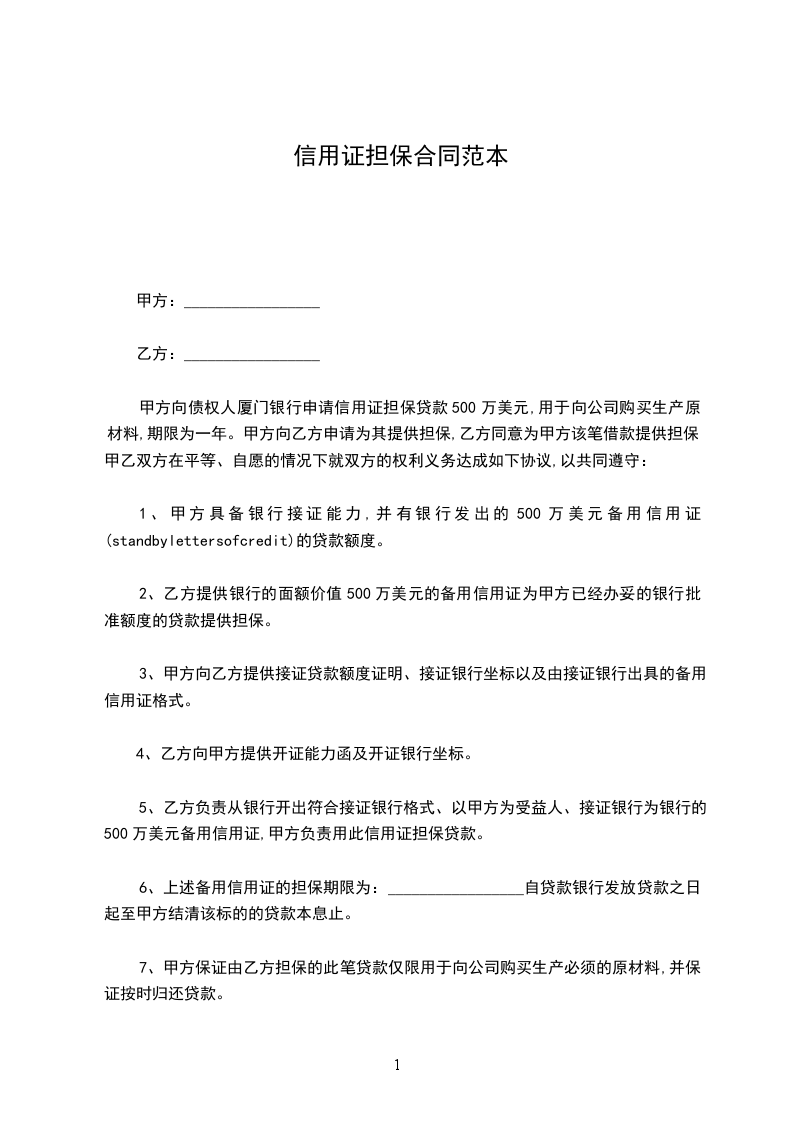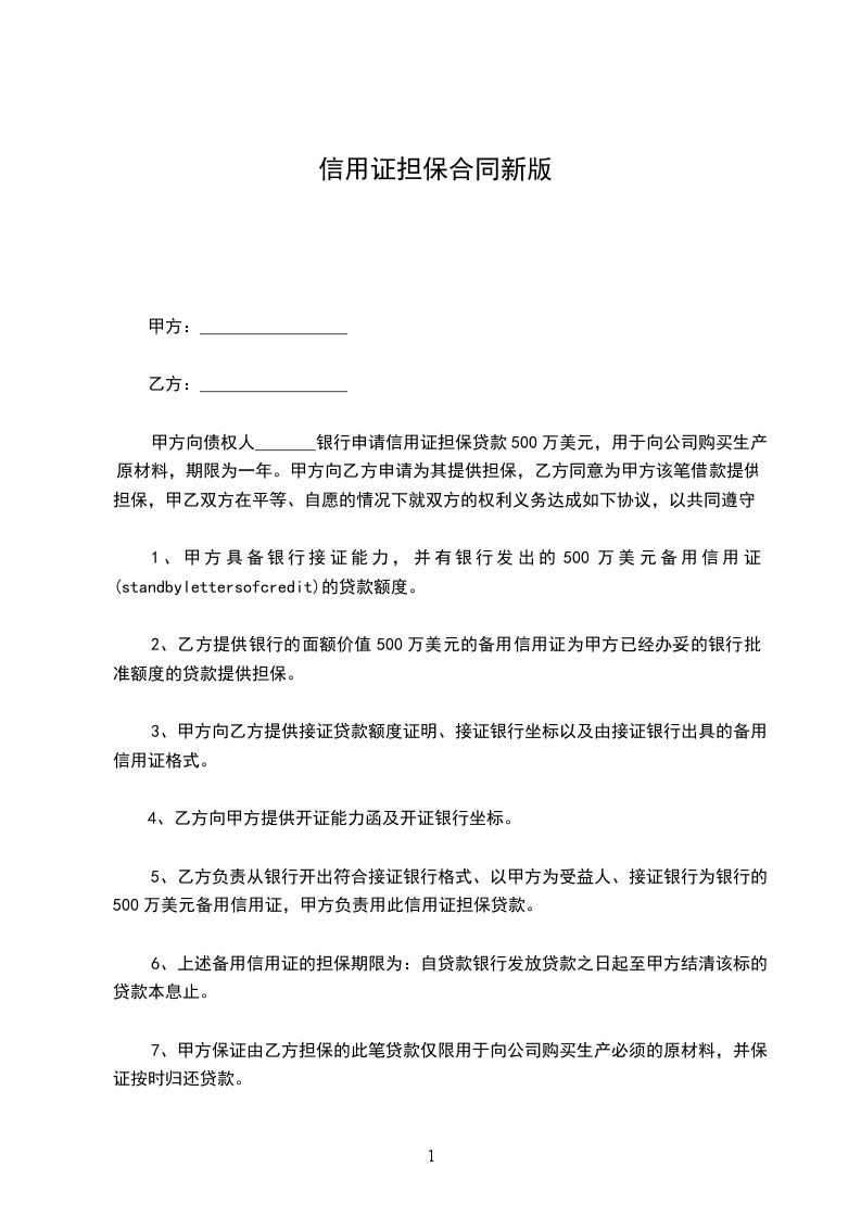 5、乙方负责从银行开出符合接证银行格式、以甲方为受益人、接证银行为银行的500万美元备用信用证,甲方负责用此信用证担保贷款。