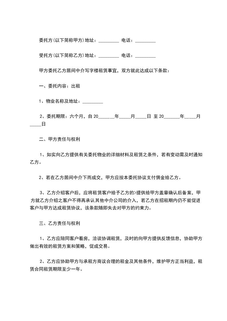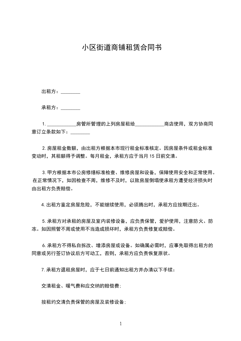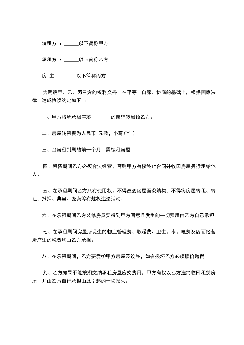 六、租赁期间,任何一方提出终止合同,需提前__________个月书面通知对方,经双方协商后签订终止合同书。若一方强行中止合同,须向另一方支付违约金_____元。