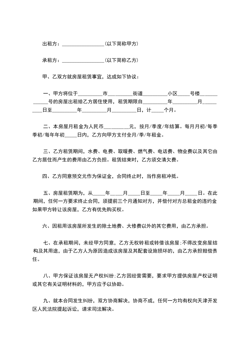 一、甲方将位于__________市__________街道__________小区_____号楼_____________号的房屋出租给乙方居住使用,租赁期限自__________年__________月__________日至__________年__________月__________日,计_____个月。
