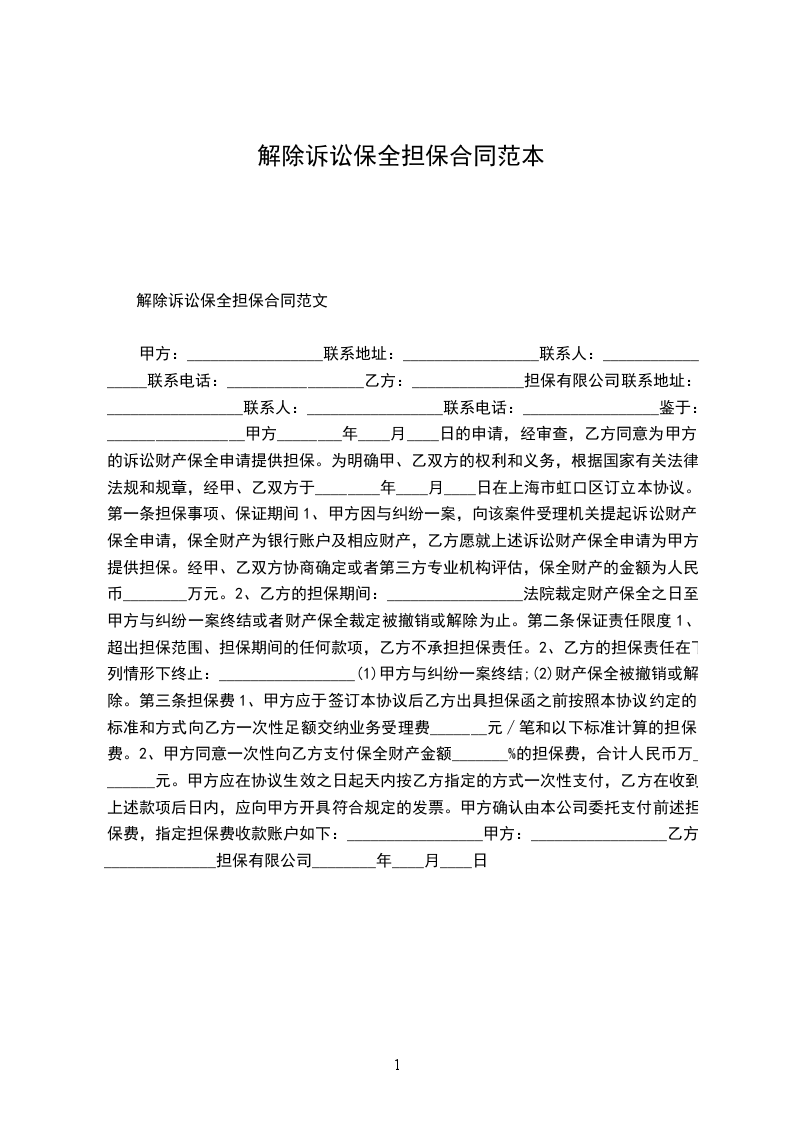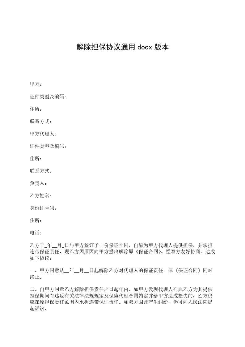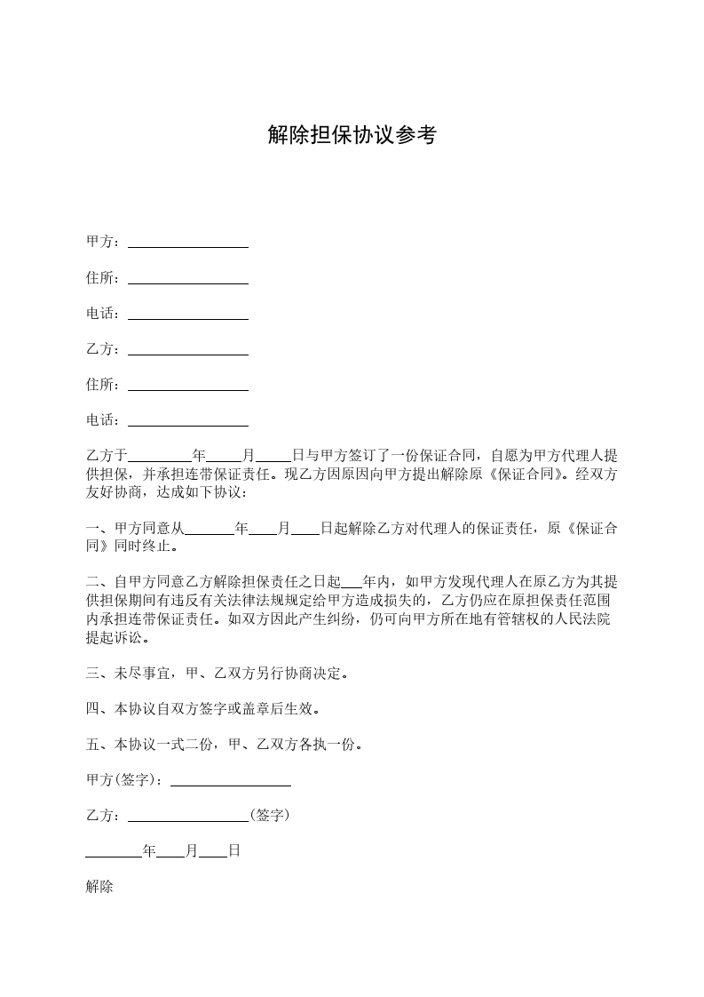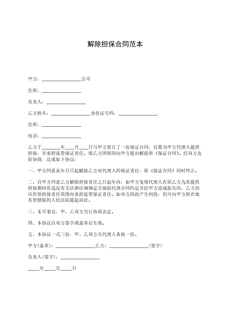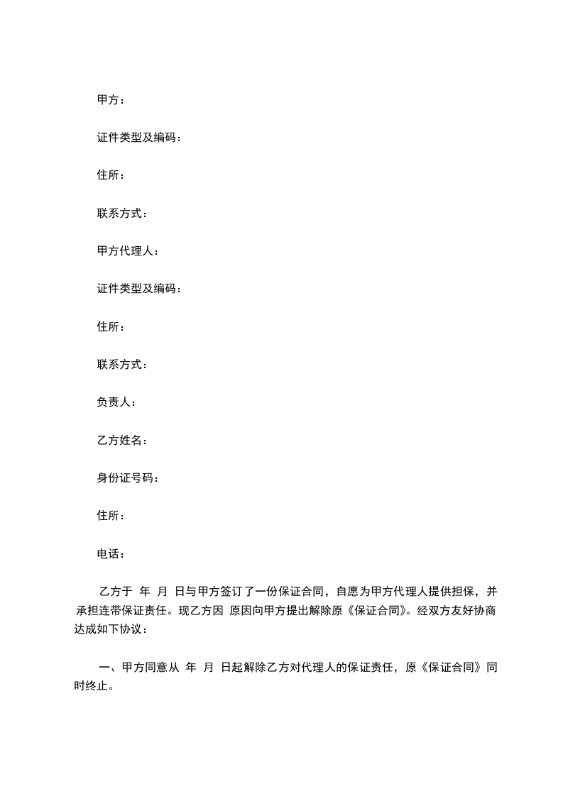 甲方:_________________公司 住所:_________________ 负责人:_________________ 乙方姓名:_________________身份证号码:_________________ 住所:_________________ 电话:_________________ 乙方于________年____月____日与甲方签订了一份保证合同,自愿为甲方代理人提供担保,并承担连带保证责任。现乙方因原因向甲方提出解除原《保证合同》。经双方友好协商,达成如下协议: 一、甲方同意从_____年_____月_____日起解除乙方对代理人的保证责任,原《保证合同》同时终止。 二、自甲方同意乙方解除担保责任之日起年内,如甲方发现代理人在原乙方为其提供担保期间有违反有关法律法规规定及保险代理合同约定并给甲方造成损失的,乙方仍应在原担保责任范围内承担连带保证责任。如双方因此产生纠纷,仍可向甲方所在地有管辖权的人民法院提起诉讼。 三、未尽事宜,甲、乙双方另行协商决定。 四、本协议自双方签字或盖章后生效。 五、本协议一式三份,甲、乙双方及代理人各执一份。 甲方(盖章):_________________乙方:_________________(签字) 负责人(签字):_________________ _____年_____月_____日