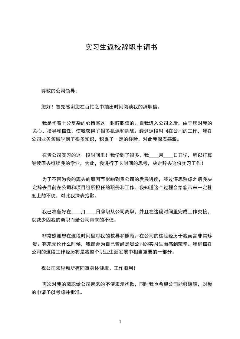 在贵公司实习的这一段时间里!我学到了很多,我____月____日开学,所以打算继续回去继续我的学业,为此,我进行了长时间的思考,决定辞去这份实习工作!