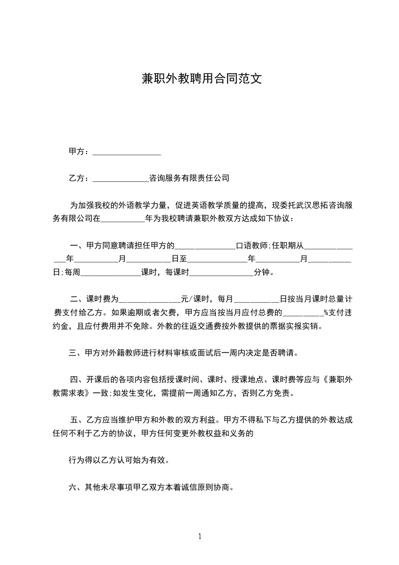 为加强我校的外语教学力量,促进英语教学质量的提高,现委托武汉思拓咨询服务有限公司在___________年为我校聘请兼职外教双方达成如下协议: