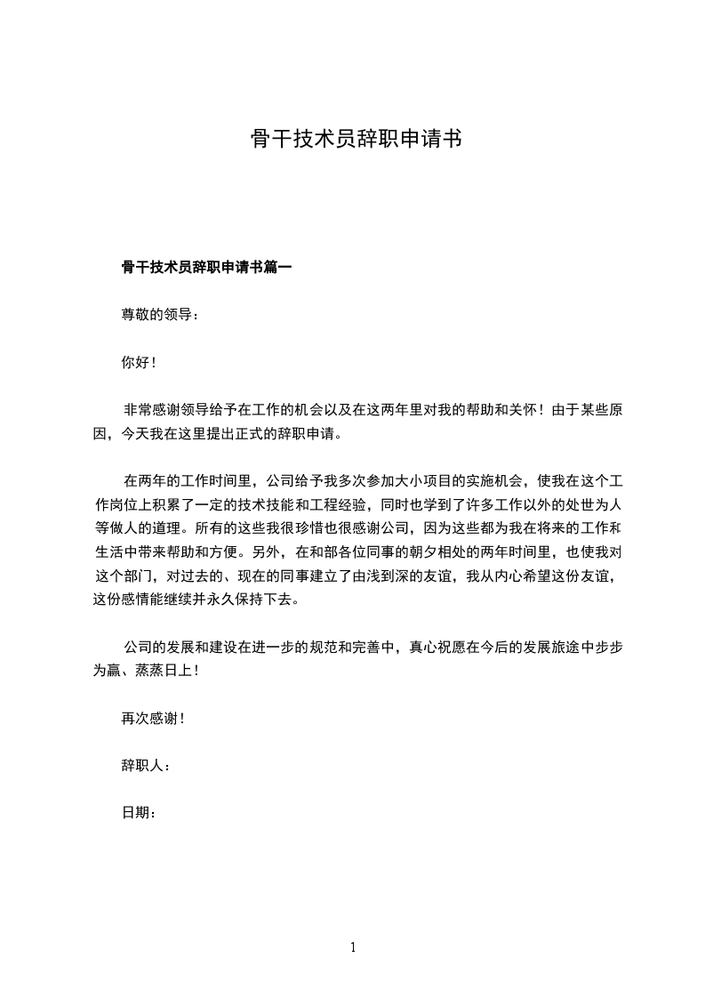骨干技术员辞职申请书篇一