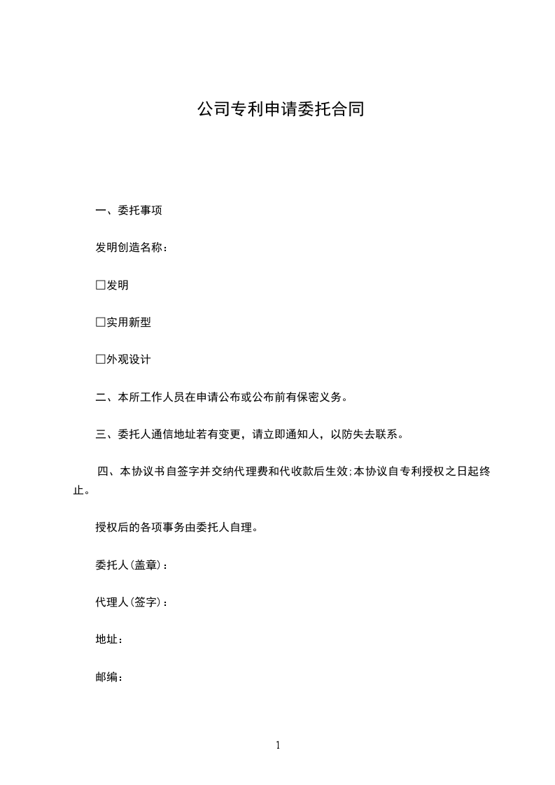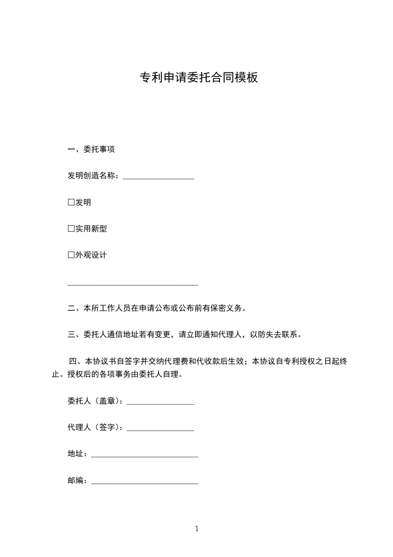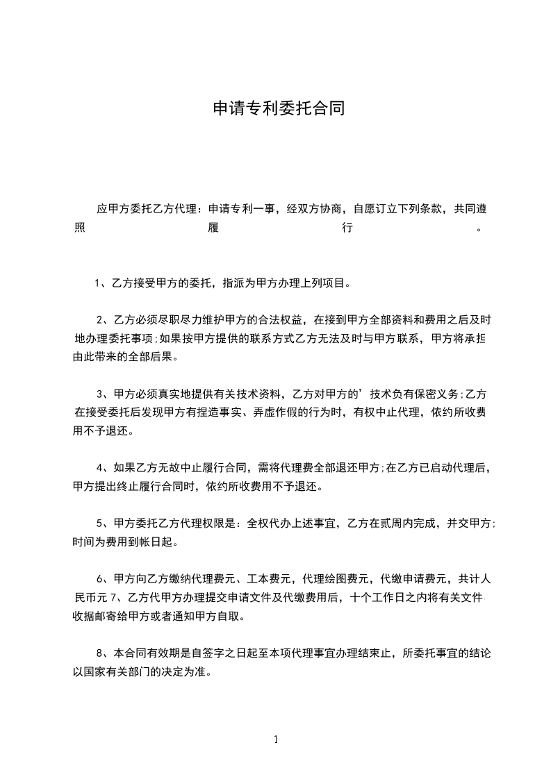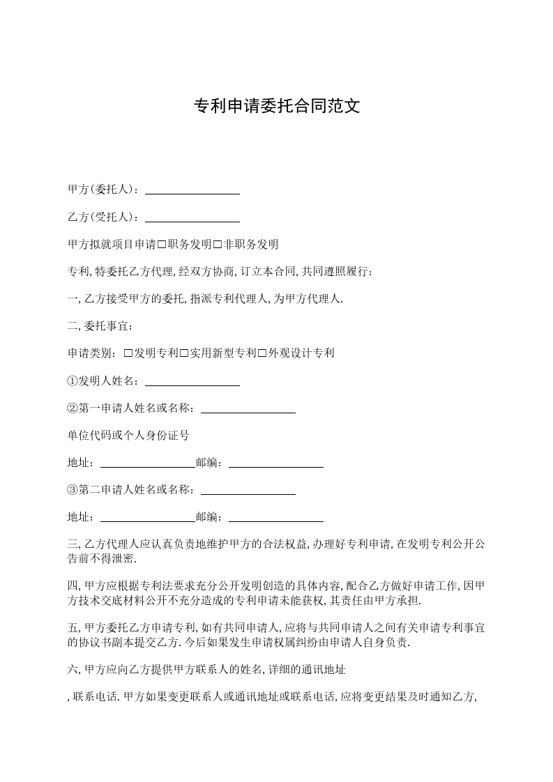 甲方(委托人):_________________ 乙方(受托人):_________________ 甲方拟就项目申请□职务发明□非职务发明 专利,特委托乙方代理,经双方协商,订立本合同,共同遵照履行: 一,乙方接受甲方的委托,指派专利代理人,为甲方代理人. 二,委托事宜: 申请类别:□发明专利□实用新型专利□外观设计专利 ①发明人姓名:_________________ ②第一申请人姓名或名称:_________________ 单位代码或个人身份证号 地址:_________________邮编:_________________ ③第二申请人姓名或名称:_________________ 地址:_________________邮编:_________________ 三,乙方代理人应认真负责地维护甲方的合法权益,办理好专利申请,在发明专利公开公告前不得泄密. 四,甲方应根据专利法要求充分公开发明创造的具体内容,配合乙方做好申请工作,因甲方技术交底材料公开不充分造成的专利申请未能获权,其责任由甲方承担. 五,甲方委托乙方申请专利,如有共同申请人,应将与共同申请人之间有关申请专利事宜的协议书副本提交乙方.今后如果发生申请权属纠纷由申请人自身负责. 六,甲方应向乙方提供甲方联系人的姓名,详细的通讯地址 ,联系电话.甲方如果变更联系人或通讯地址或联系电话,应将变更结果及时通知乙方,否则,其后果由甲方承担. 七,乙方应按照甲方提供的通讯地址或通讯电话及时向甲方传达知识产权局有关文件(包括申请受理,授权通知,专利证书等). 八,根据乙方的收费办法,双方商定甲方应向乙方支付代理,咨询,服务等费用为人民币___________元.对于发明专利需缴纳实审代理费,人民币_____元.上述费用需在委托时或完成申请文件时缴纳,最迟需在乙方递交专利申请后一周内结清,逾期不结清,本代理委托合同即为终止.对于专利授权后的监视年费和代缴年费的手续费另收. 九,如专利申请获得授权,本委托代理合同到获得专利证书自然终止.如专利申请未通过审查,本委托代理合同到收到专利局的视撤或驳回通知书自然终止. 甲方:_________________(盖章)乙方:_________________ 代表:_________________(签字)代表:_________________(签字) ________年____月____日________年____月____日