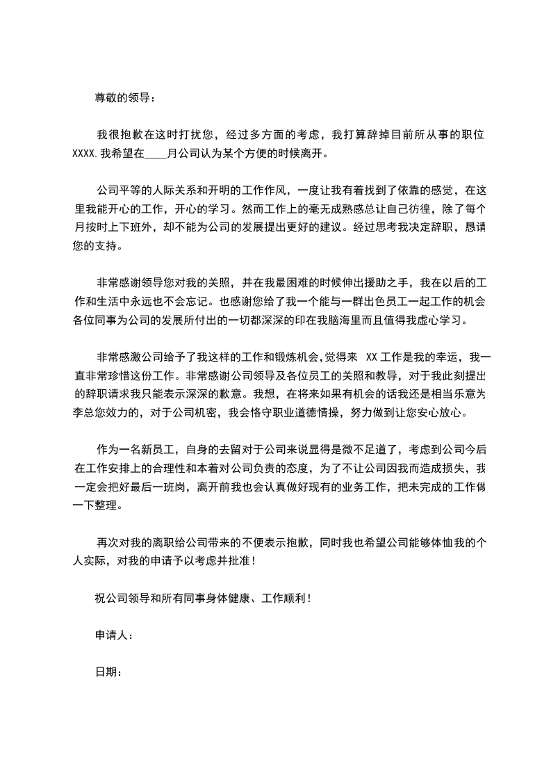 非常感激公司给予了我这样的工作和锻炼机会,觉得来XX工作是我的幸运,我一直非常珍惜这份工作。非常感谢公司领导及各位员工的关照和教导,对于我此刻提出的辞职请求我只能表示深深的歉意。我想,在将来如果有机会的话我还是相当乐意为李总您效力的,对于公司机密,我会恪守职业道德情操,努力做到让您安心放心。