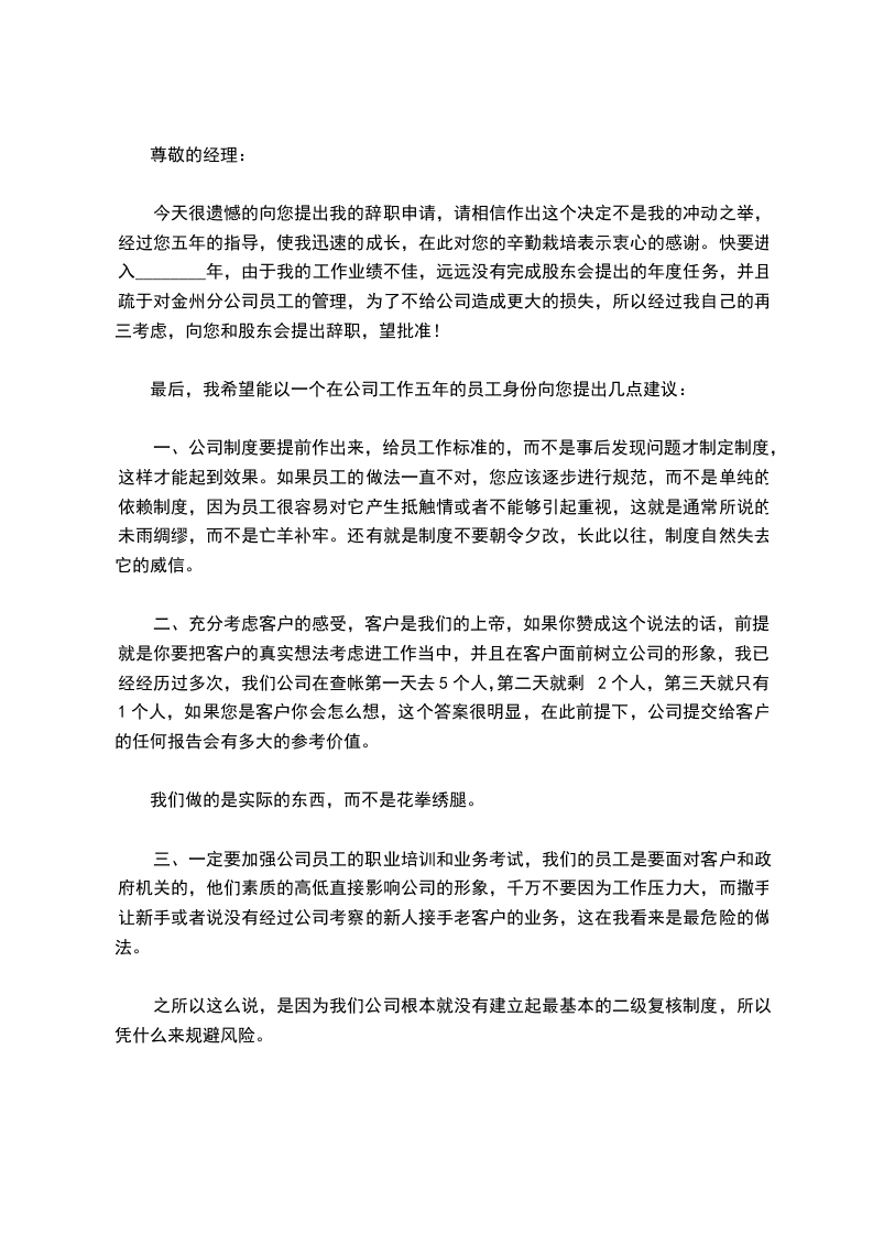今天很遗憾的向您提出我的辞职申请,请相信作出这个决定不是我的冲动之举,经过您五年的指导,使我迅速的成长,在此对您的辛勤栽培表示衷心的感谢。快要进入________年,由于我的工作业绩不佳,远远没有完成股东会提出的年度任务,并且疏于对金州分公司员工的管理,为了不给公司造成更大的损失,所以经过我自己的再三考虑,向您和股东会提出辞职,望批准!