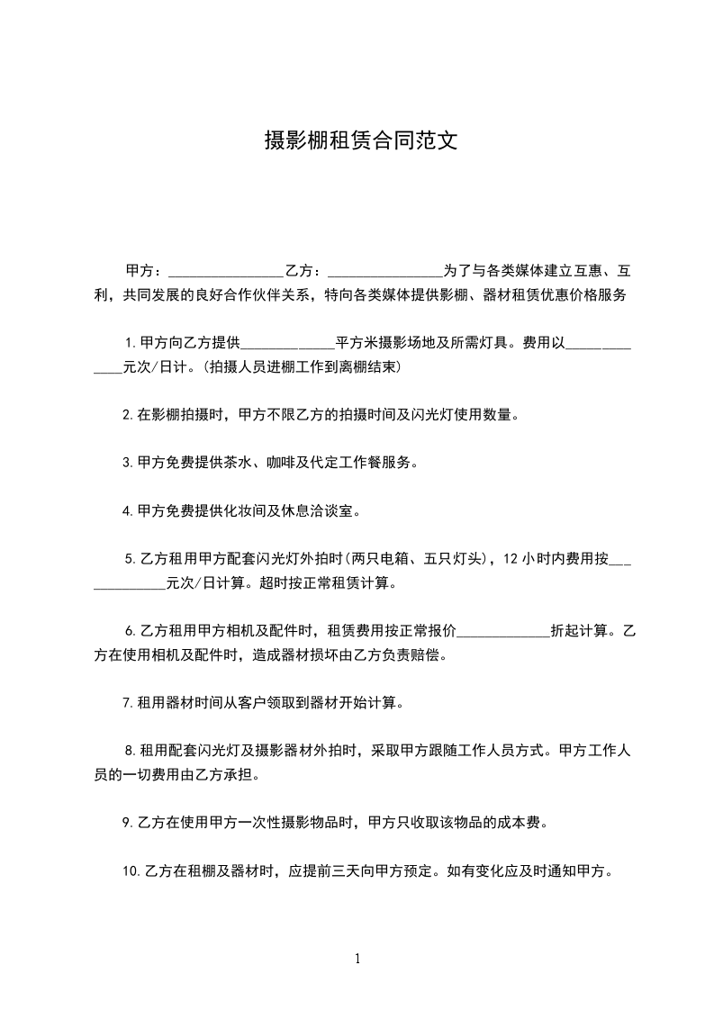 甲方:________________乙方:________________为了与各类媒体建立互惠、互利,共同发展的良好合作伙伴关系,特向各类媒体提供影棚、器材租赁优惠价格服务。
