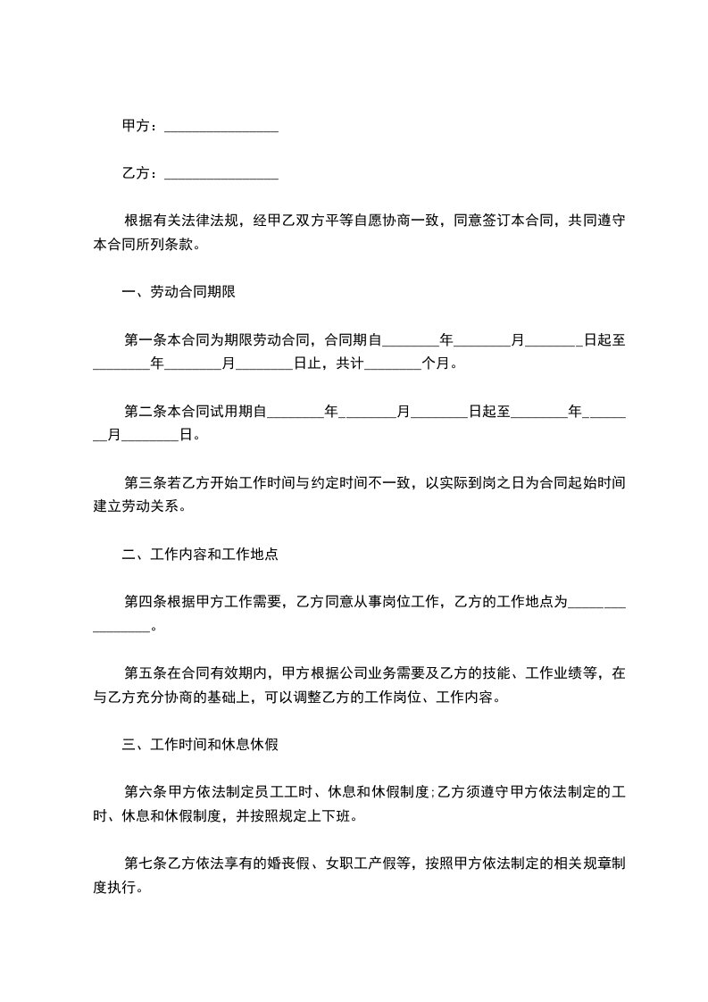 甲方:_____________ 乙方:_____________ 根据有关法律法规,经甲乙双方平等自愿协商一致,同意签订本合同,共同遵守本合同所列条款。 一、劳动合同期限 第一条本合同为期限劳动合同,合同期自__________年_____月_____日起至__________年_____月_____日止,共计______个月。 第二条本合同试用期自__________年_____月_____日起至__________年_____月_____日。 第三条若乙方开始工作时间与约定时间不一致,以实际到岗之日为合同起始时间建立劳动关系。 二、工作内容和工作地点 第四条根据甲方工作需要,乙方同意从事岗位工作,乙方的工作地点为_____________。 第五条在合同有效期内,甲方根据公司业务需要及乙方的技能、工作业绩等,在与乙方充分协商的基础上,可以调整乙方的工作岗位、工作内容。 三、工作时间和休息休假 第六条甲方依法制定员工工时、休息和休假制度;乙方须遵守甲方依法制定的工时、休息和休假制度,并按照规定上下班。 第七条乙方依法享有的婚丧假、女职工产假等,按照甲方依法制定的相关规章制度执行。 四、劳动报酬 第八条甲方根据法律、法规的规定,遵循按劳分配的原则,结合本公司实际和乙方的工作岗位,确定乙方的工资水平。 第九条乙方月工资标准为__________元,试用期满后的工资标准按甲方依法制定的薪酬管理办法执行,但甲方支付给乙方的工资不得低于当地政府公布的当年度最低工资标准。 第十条甲方有权根据其生产经营状况、乙方工作岗位的变更和依法制定的薪酬管理办法等公司制度调整乙方的工资待遇。 第十一条甲方于每月_____日以货币形式,按照公司规定的月工资标准足额向乙方支付工资,如遇节假日则提前一天或延至节日假满;以货币形式向乙方足额支付月实发奖金。 五、劳动保护、劳动条件和职业危害防护 第十二条甲方为乙方提供符合国家规定的劳动标准的工作条件和必要的劳动防护用品,切实保护乙方在工作中的安全和健康。 第十三条甲方负责对乙方进行思想政治、职业道德、业务技术、劳动安全卫生及有关规章制度的教育和培训,乙方应自觉遵守国家和本公司规程。 第十四条如乙方在工作过程中产生职业危害病,甲方则按《职业病防治法》等规定保护乙方的健康及相关权益。六、劳动合同的变更、解除、终止和续订 第十五条甲乙双方在本劳动合同的有效期内,可以遵循平等自愿、协商一致的原则,依法变更劳动合同部分条款。 第十六条订立劳动合同所依据的法律、法规、规章制度发生变化导致本合同内容发生变化时,可以对本合同相关内容进行变更。 第十七条订立本合同的客观情况发生重大变化,致使本合同无法履行的,经甲乙双方协商同意,可以变更本合同相关内容或解除本合同。 第十八条经甲乙双方协商一致,本合同可以解除。 第十九条甲乙双方解除劳动合同,必须按国家有关法律、法规及甲方依法制定的相关制度执行。 第二十条有下列情形之一,本合同自行终止: 1.合同期满且双方不能就劳动合同续签达成一致的; 2.甲方经营的状况不佳或已经破产关闭; 3.乙方应征入伍或者履行国家规定的其他法定义务的; 4.法律法规规定的其他情形。 第二十一条本合同期满前,甲乙双方应按照有关规定就合同续订或者终止事宜表明自己的意见,并办理相关书面手续。 七、违反劳动合同的责任 第二十二条乙方未提前30天向甲方提出辞职或有其他擅自离职情形的,甲方将在乙方办理交接工作后支付乙方的当月工资和办理相关的离职手续;由此给甲方造成经济损失的,乙方应承担相应的赔偿责任。 第二十三条甲乙双方任何一方违反本合同及其附件的约定,给对方造成经济损失的,应根据实际造成的损失依法给对方予以赔偿。 八、劳动争议处理 第二十四条甲乙双方在履行本合同中若发生劳动争议,应当协商解决,协商不成的,当事人一方要求仲裁的,应当自劳动争议发生之日起六十日内可以向相关部门提请仲裁。 九、其他规定 第二十五条本合同未尽事宜,按照国家及地方法律法规及甲方的规章制度执行。 第二十六条签订本合同所依据的法律法规修改、废止的,依法执行新的法律、法规。 第二十七条本合同自__________之日起生效。 第二十八条本合同一式贰份,甲乙双方各执壹份。 甲方:________________(签章)乙方:________________(签章) __________年_____月_____日__________年_____月_____日
