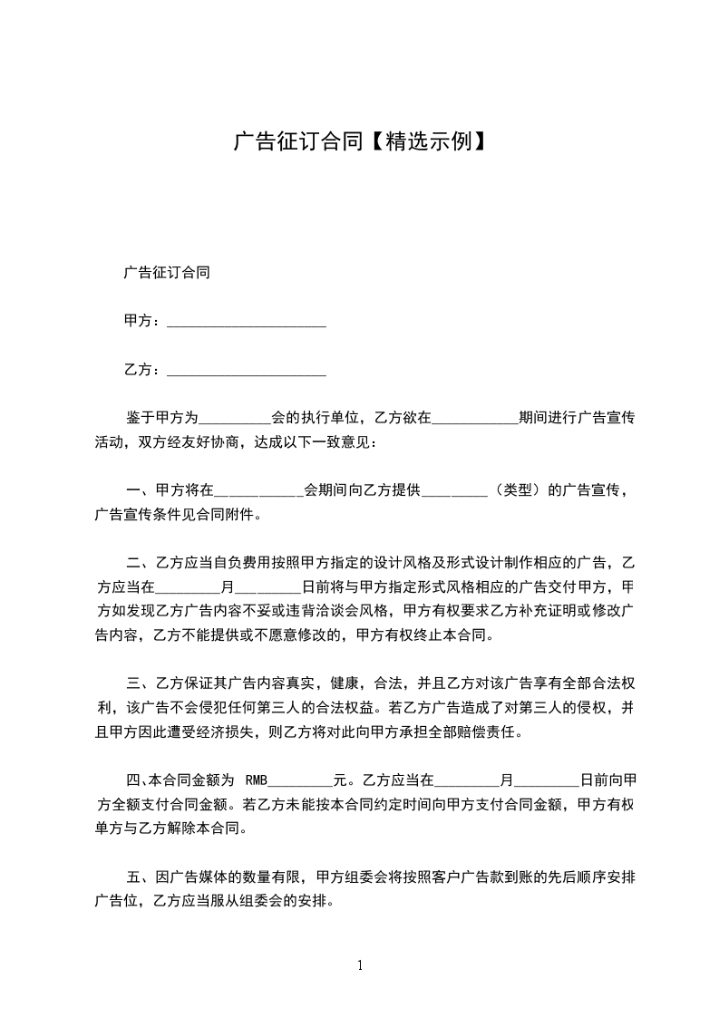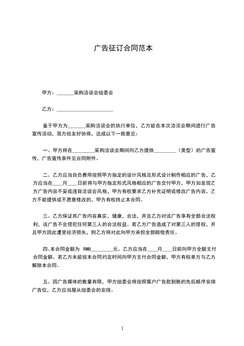 一、甲方将在_________采购洽谈会期间向乙方提供_________(类型)的广告宣传,广告宣传条件见合同附件。