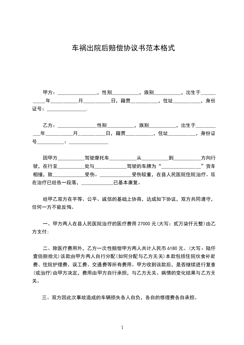 二、除医疗费用外,乙方一次性赔偿甲方两人共计人民币6180元。(大写:陆仟壹佰捌拾元)该款由甲方两人自行分配(如何分配与乙方无关)本款包括住院伙食补助费、住院护理费、误工费、交通费等所有费用。甲方收到该款后,是否继续进行复查(或治疗)由甲方决定,费用由甲方自行承担,与乙方无关。病情的变化结果与乙方无关。