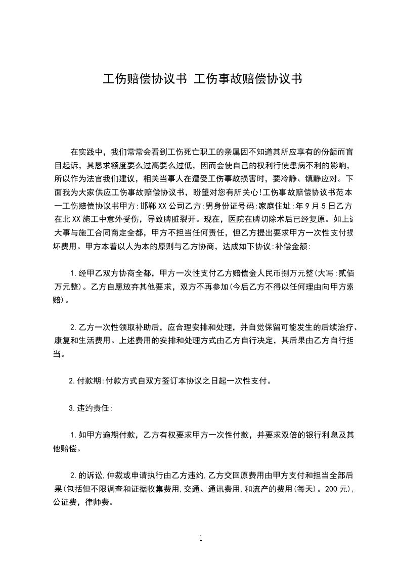 乙方于 _______ 年 _______ 月 _______ 日在_______________区施工工地施工时不慎发生伤害事故,左手腕骨骨裂。事后,甲方立即将乙方送往医院抢治,经治疗后复查,现无大碍,为妥善解决乙方受伤事宜,甲乙双方本着平等自愿、互谅互让的原则,经友好协商达成如下协议:________________