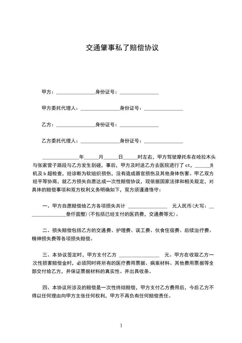 _______________年______月______日______时左右,甲方驾驶摩托车在哈拉木头与张家营子路段与乙方发生刮碰,事后,甲方及时送乙方去医院进行了ct,______光机及b超检查,经诊断为软组织损伤,没有造成器官损伤及其他身体伤害。甲乙双方经平等协商,就乙方损失自愿达成一次性赔偿协议,现依据国家法律和相关规定,对具体的赔偿事项和双方权利义务明确如下,双方须谨遵恪守: