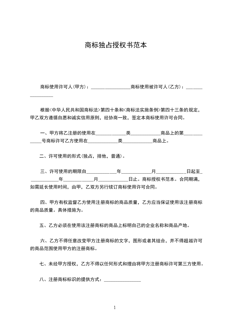 一、甲方将乙注册的使用在_____________类_____________商品上的第_____________号商标许可乙方使用在_____________类_____________商品上。