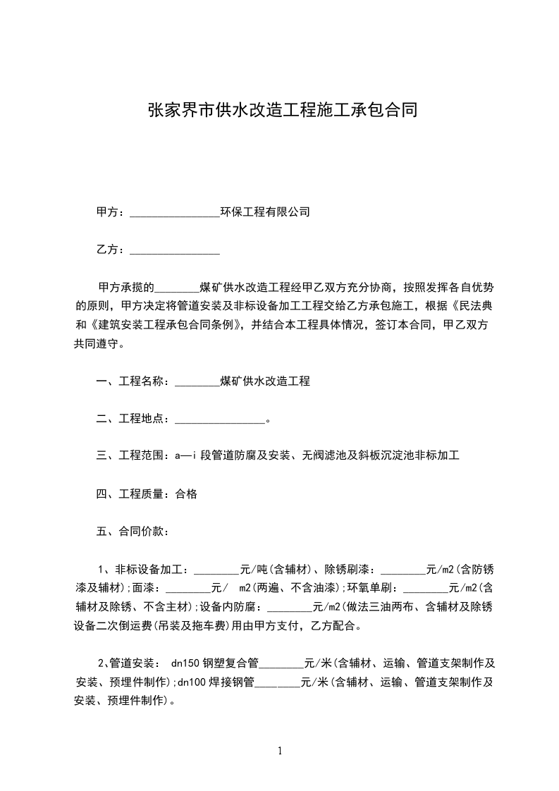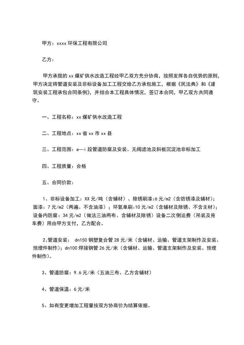 甲方承揽的xx煤矿供水改造工程经甲乙双方充分协商,按照发挥各自优势的原则,甲方决定将管道安装及非标设备加工工程交给乙方承包施工,根据《民法典》和《建筑安装工程承包合同条例》,并结合本工程具体情况,签订本合同,甲乙双方共同遵守。